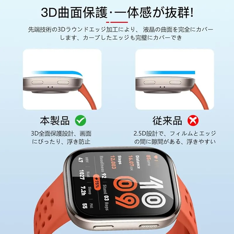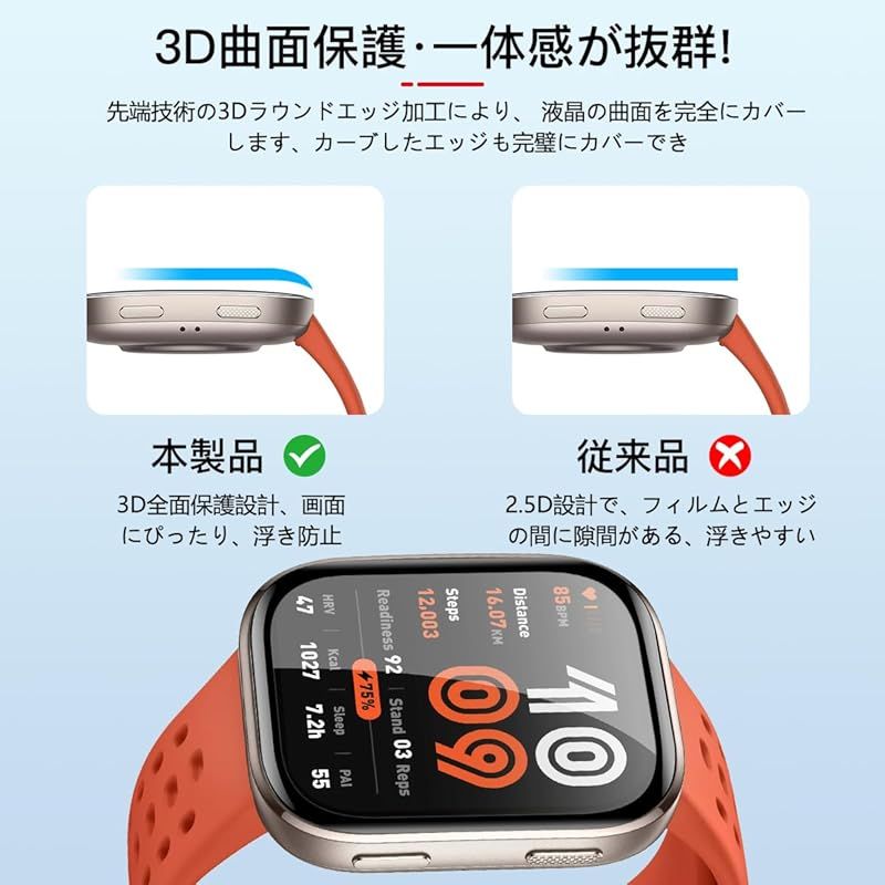 【3D曲面加工・全面保護】先端技術の3Dラウンドエッジ加工により、 液晶の曲面を完全にカバーします、カーブしたエッジも完璧にカバーでき。従来の2.5Dラウンドエッジ製品よりフィット感が良いです。Fitbit Versa4 / Fitbit Sense2を全面保護し、角割れも防止します。これはスクリーンに最大のカバー範囲を提供するために設計されました。 ★