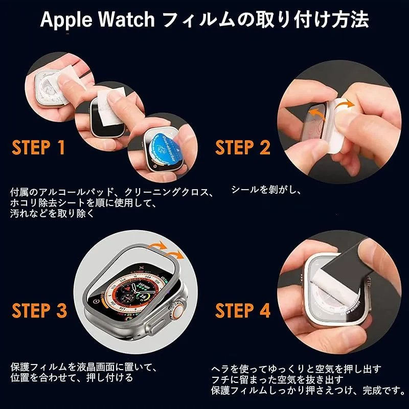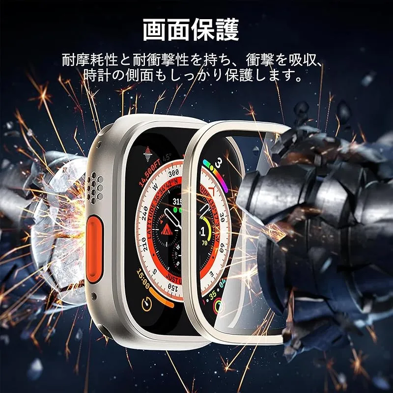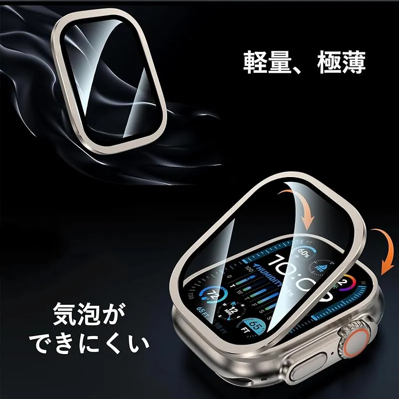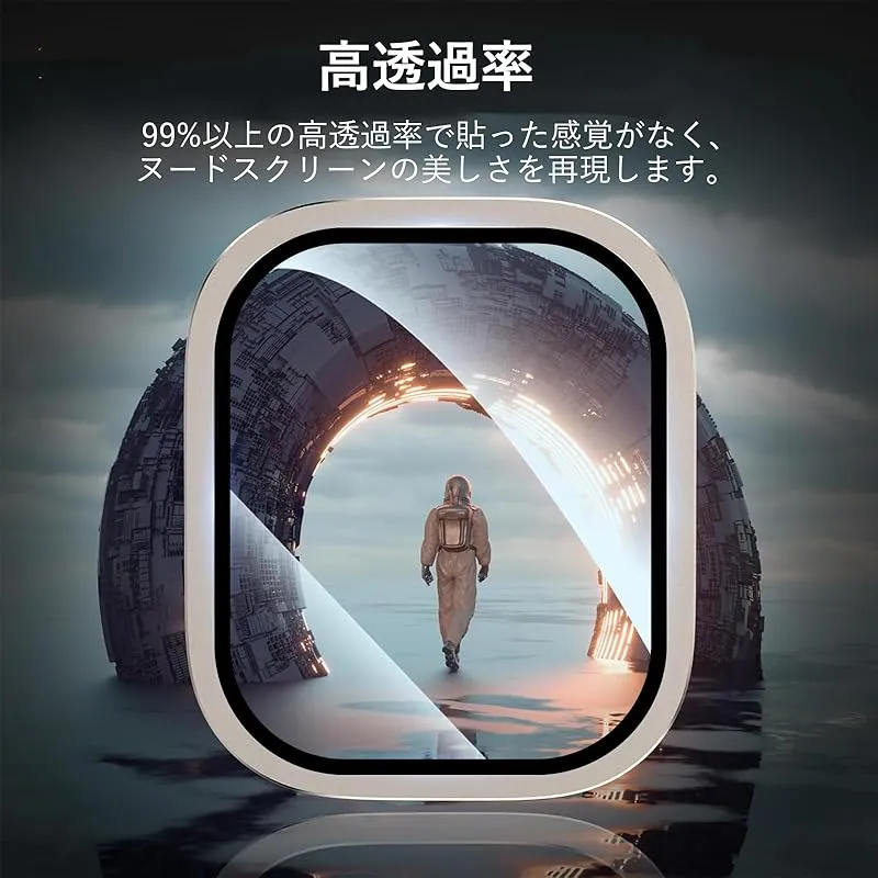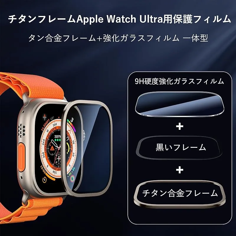 【商品概要】 「チタン合金フレームApple Watch Ultra 3/2/1保護フィルム」チタン合金フレームのApple Watch Ultra 3/2/1保護フィルムはApple Watch Ultra 3/2/1本体と同じ素材のチタン合金+硬度9Hの強化ガラスフィルムを採用し、Apple Watch Ultra 3/2/1の画面から端までを保護し、耐磨耗性と耐衝撃性に優れ、ぶつけたりしても安心して使い、より全面的な保護を提供します。 「高透過率 & スムーズなタッチ感」この Apple Watch Ultra 3/2/1保護フィルムは 0.25mm まで薄くなっており、高透明タイプで、スムーズなタッチ感で、まるで貼っていないかのように画面本来の美しさを再現します。 「全面粘着加工&気泡ゼロ」この Apple Watch Ultra 3/2/1保護フィルムは全面粘着加工を採用しており、画面全体に合わせ、しっかりと貼り付けられ、気泡がなく、端も浮きません。 「防水/指紋防止」撥油コーティングが施されているため、撥水、撥油機能が得られ、指紋や汚れが付きにくい。 「貼り付けやすい」このApple Watch Ultra 3/2/1保護フィルムは貼り付け補助ツール(円形固定器*2、クリーニングセット*2、マイクロファイバークロス*1、気泡抜き用スクレイパー*1、日本語説明書*1)を付属し、1:1 の実物モールドを使用し、簡単に貼り付けることができます。「対応機種」Apple Watch Ultra3/2/1(アップルウォッチ ウルトラ3/2/1),49mm。
