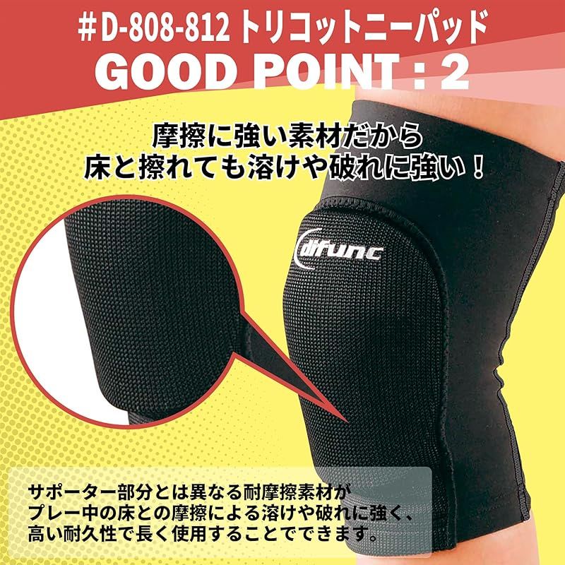 【ディファンク トリコットニーパッドの特徴】 トリコット生地の高い伸縮性から抜群のフィット感を実現しました。 洗濯してもすぐに乾くほどの吸汗速乾性で、サポーター内部の汗による蒸れやベタつきを軽くします。 ひざ裏部分がメッシュになっているので通気性が高く、サポーターの生地がたまりやすい部分も蒸れにくくなっています。 肌に当たる内側(メッシュ部分は除く)はわずかに起毛加工になっているので、プレーで膝の曲げ伸ばしを繰り返してもサポーターがずれにくくなっています。 また、膝頭のパッドを包む部分は摩擦耐性の高い素材を使用しているので、床と擦れても溶けて穴が開きにくくなっています。