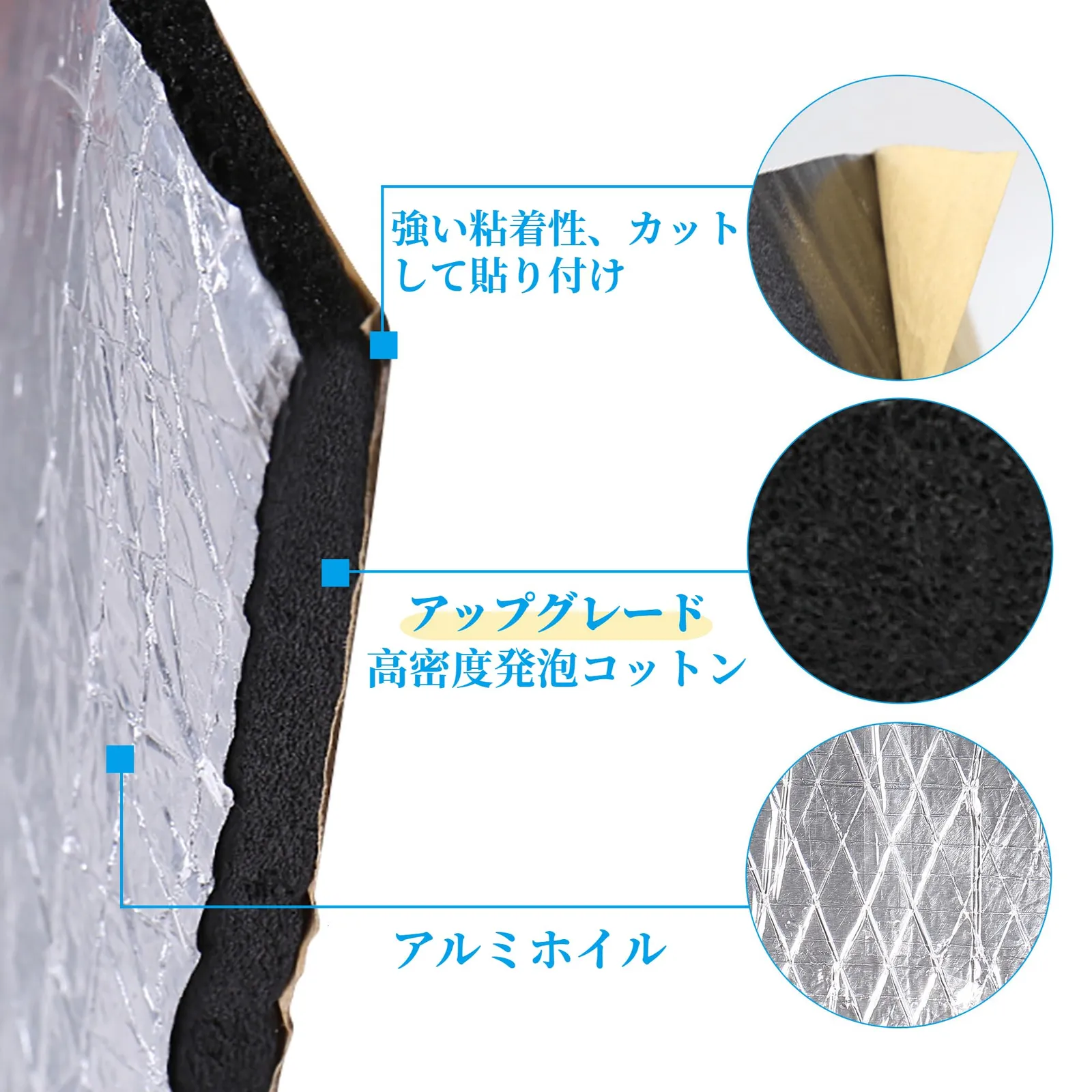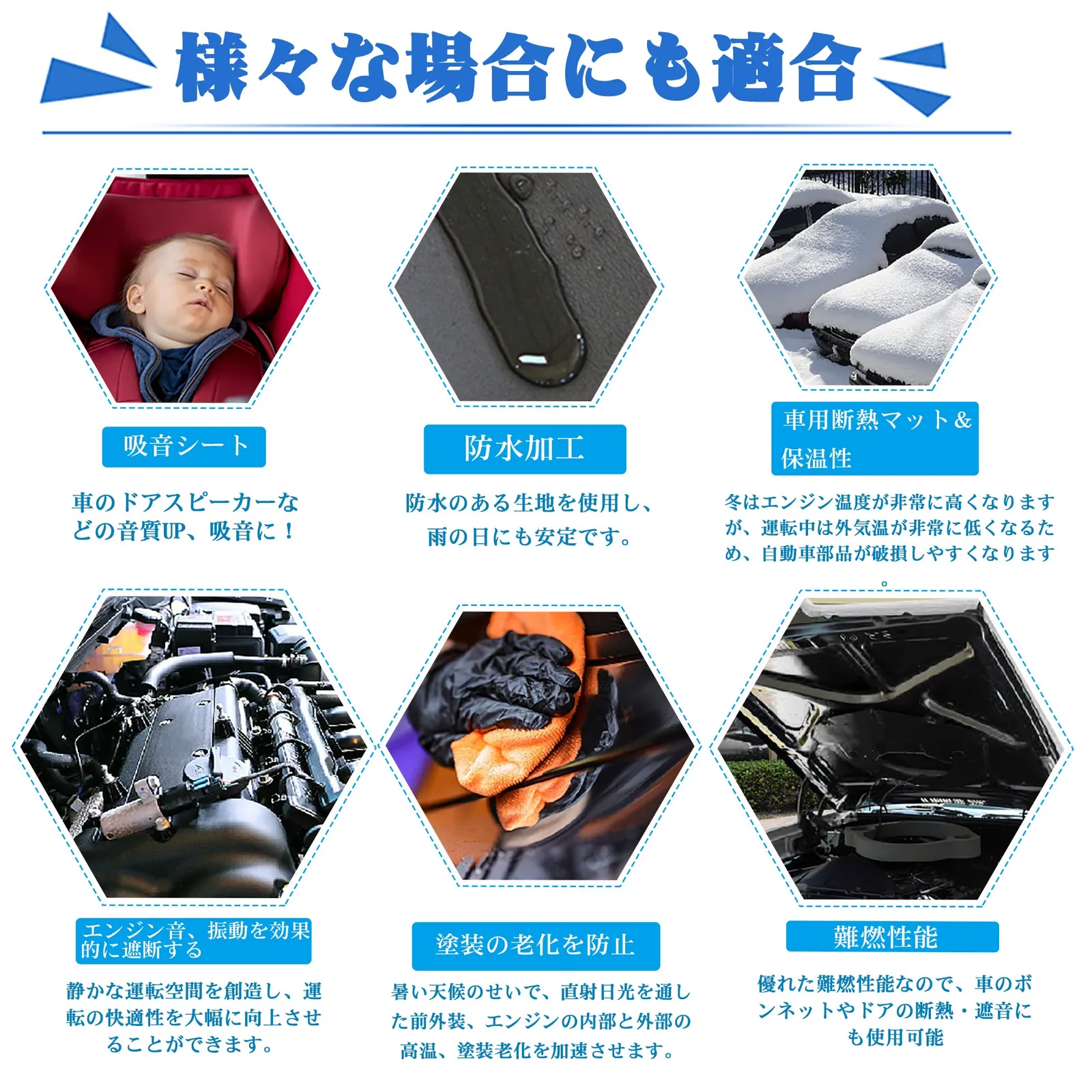 【防音性】本製品は優れた防音性能を持っています!1.ロードノイズを抑えます.2.雨音やエンジン音、風切り音、ビビリ・きしみ音、その他様々運転中に車から発生するノイズを吸収します.3.スピーカー音質の向上させます.