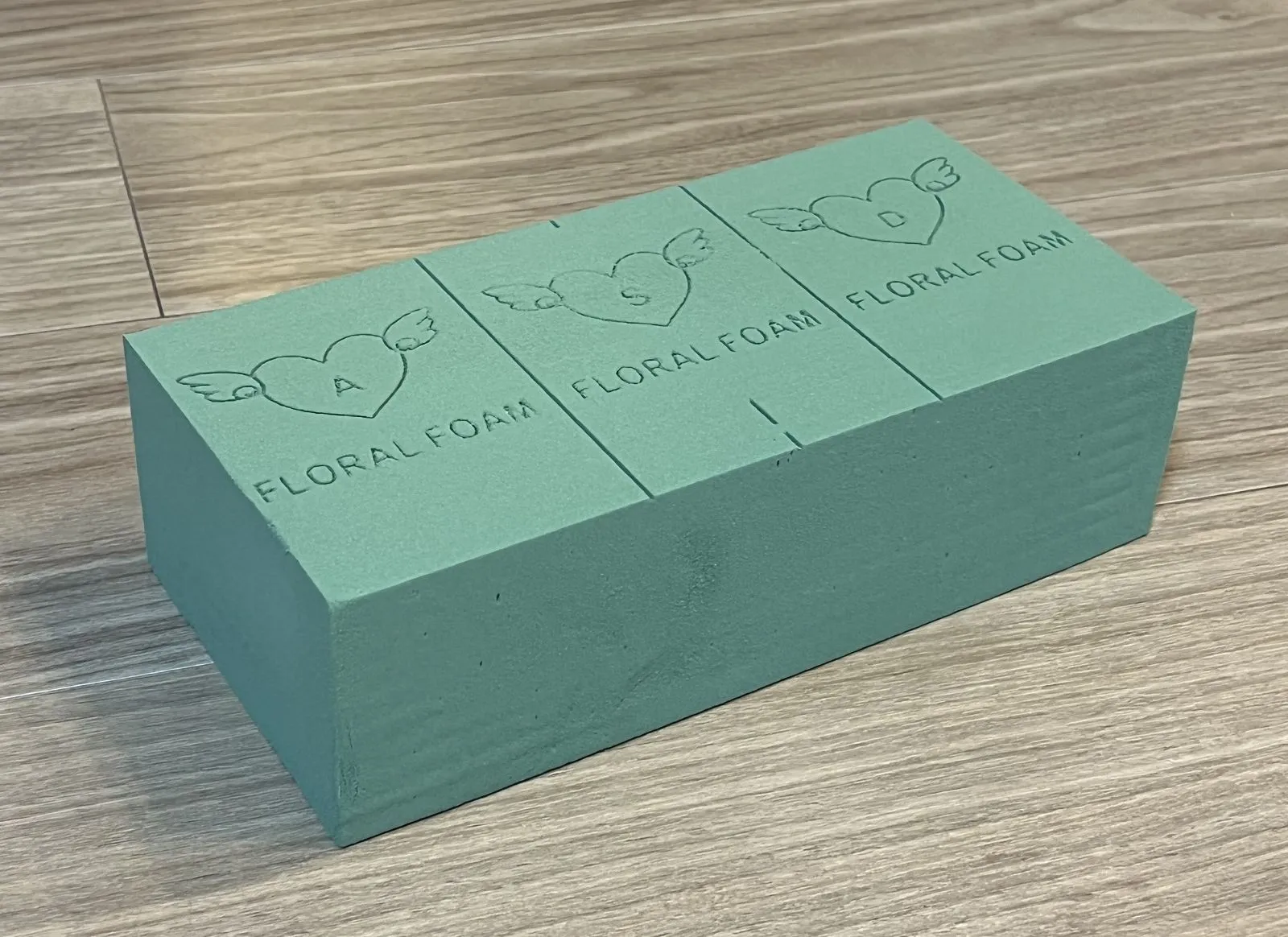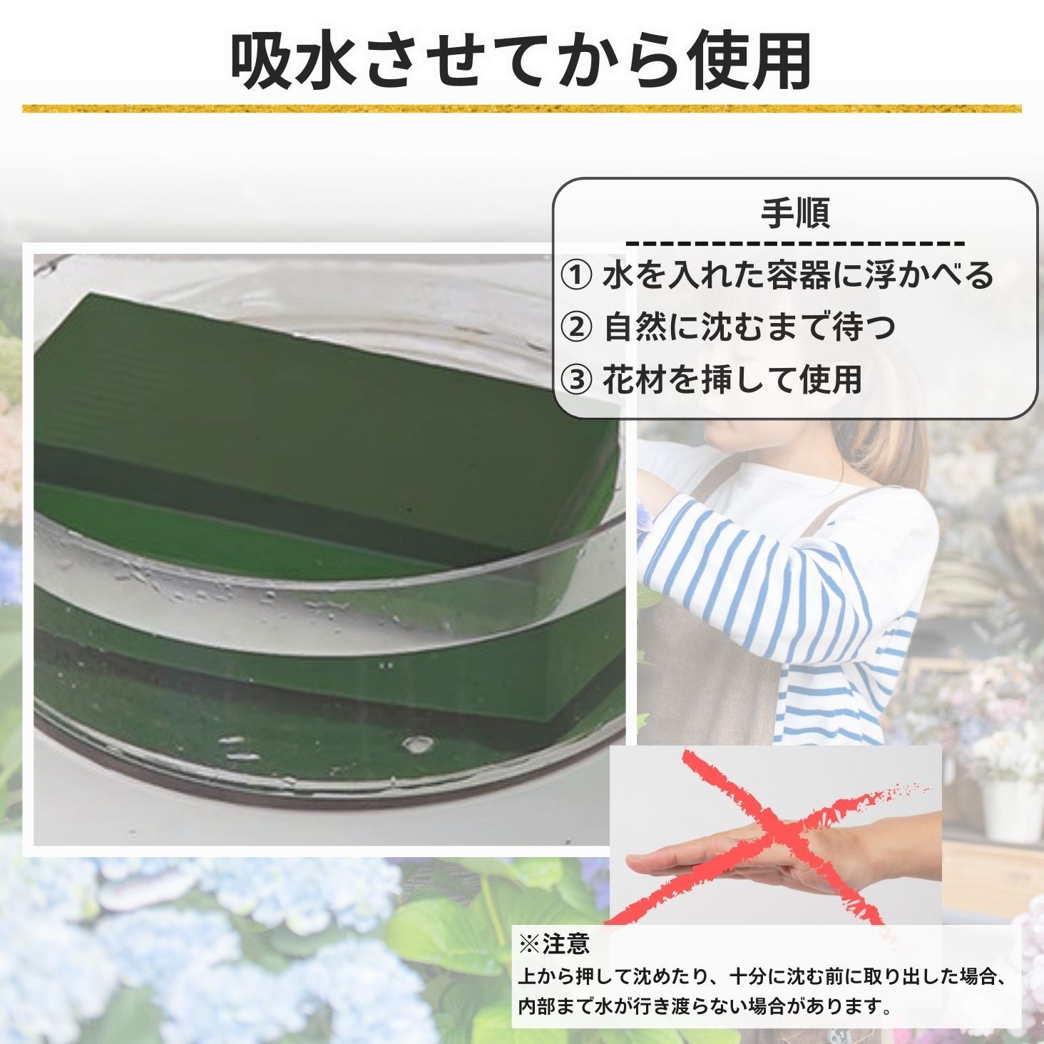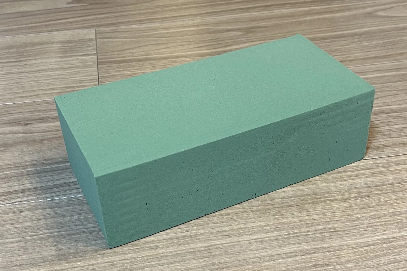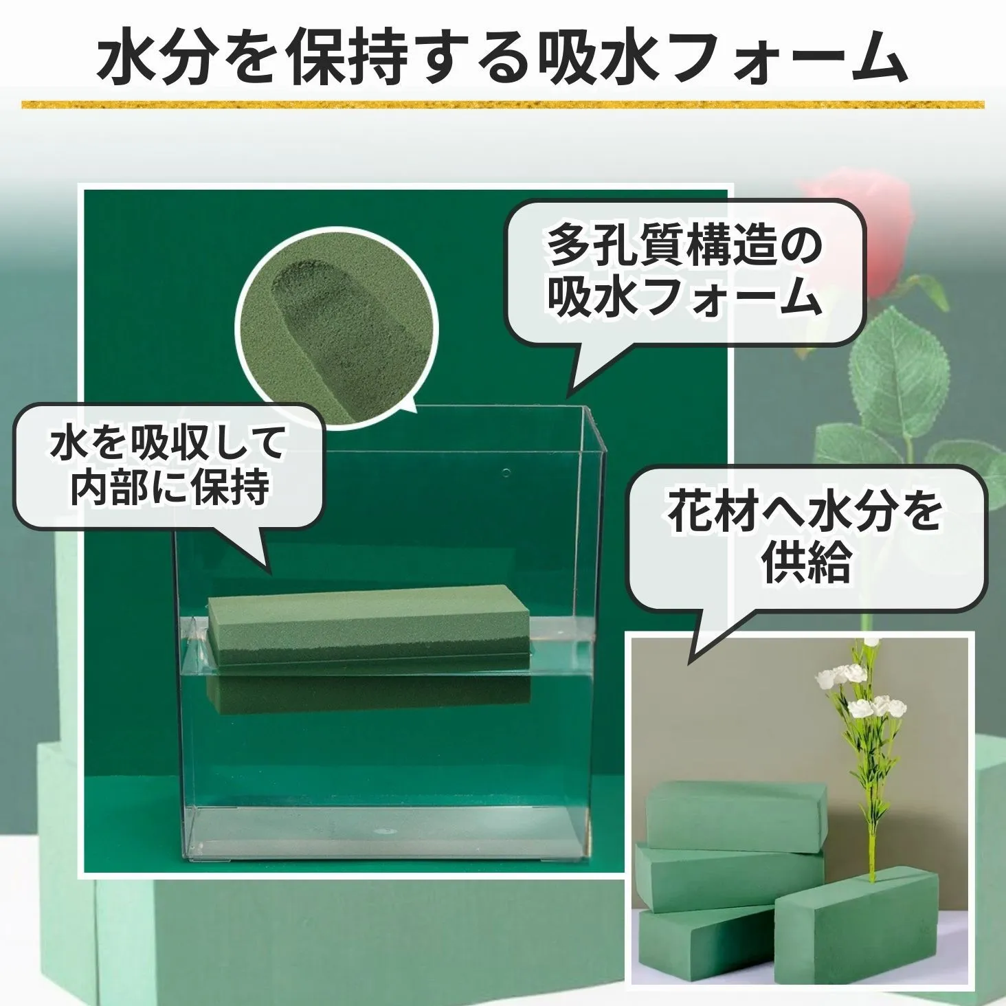 【使用方法】 フローラルフォームは使用前に水を吸収させてから使用します。容器に水を入れてフォームを浮かべると、スポンジ内部の空気が抜けながらゆっくり水を吸収します。フォーム全体に水が行き渡るよう、自然に沈むのを待ってから使用する方法がよく用いられています。上から押して沈めたり、十分に沈む前に取り出した場合、内部まで水が行き渡らないことがあるため、ゆっくり吸水させることで安定した状態で使用しやすくなります。吸水後のフォームは花器やフラワーベースに設置し、花材を挿してフラワーアレンジメントを作ることができます。家庭用の花飾りからフラワーギフト制作まで幅広い場面で使用されています。