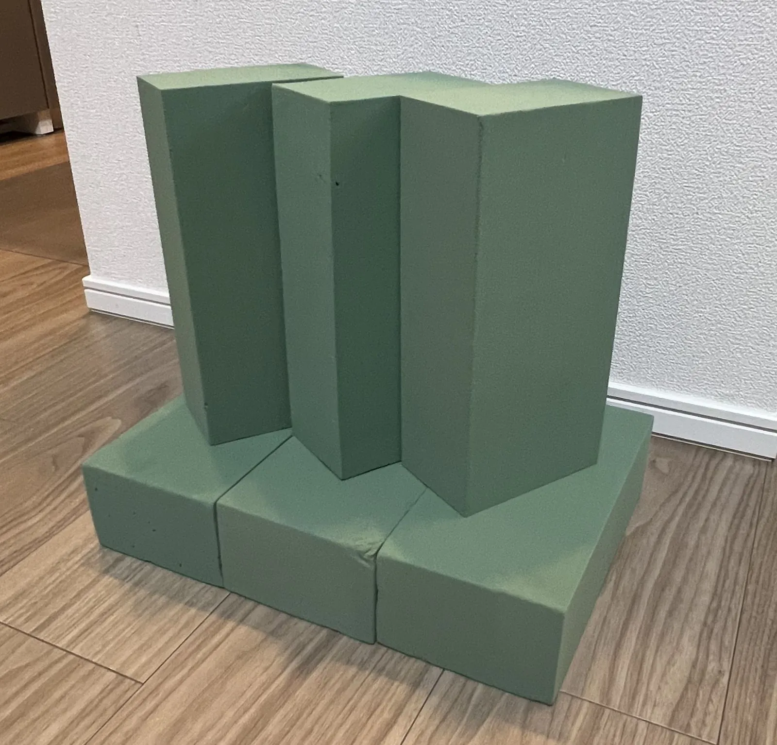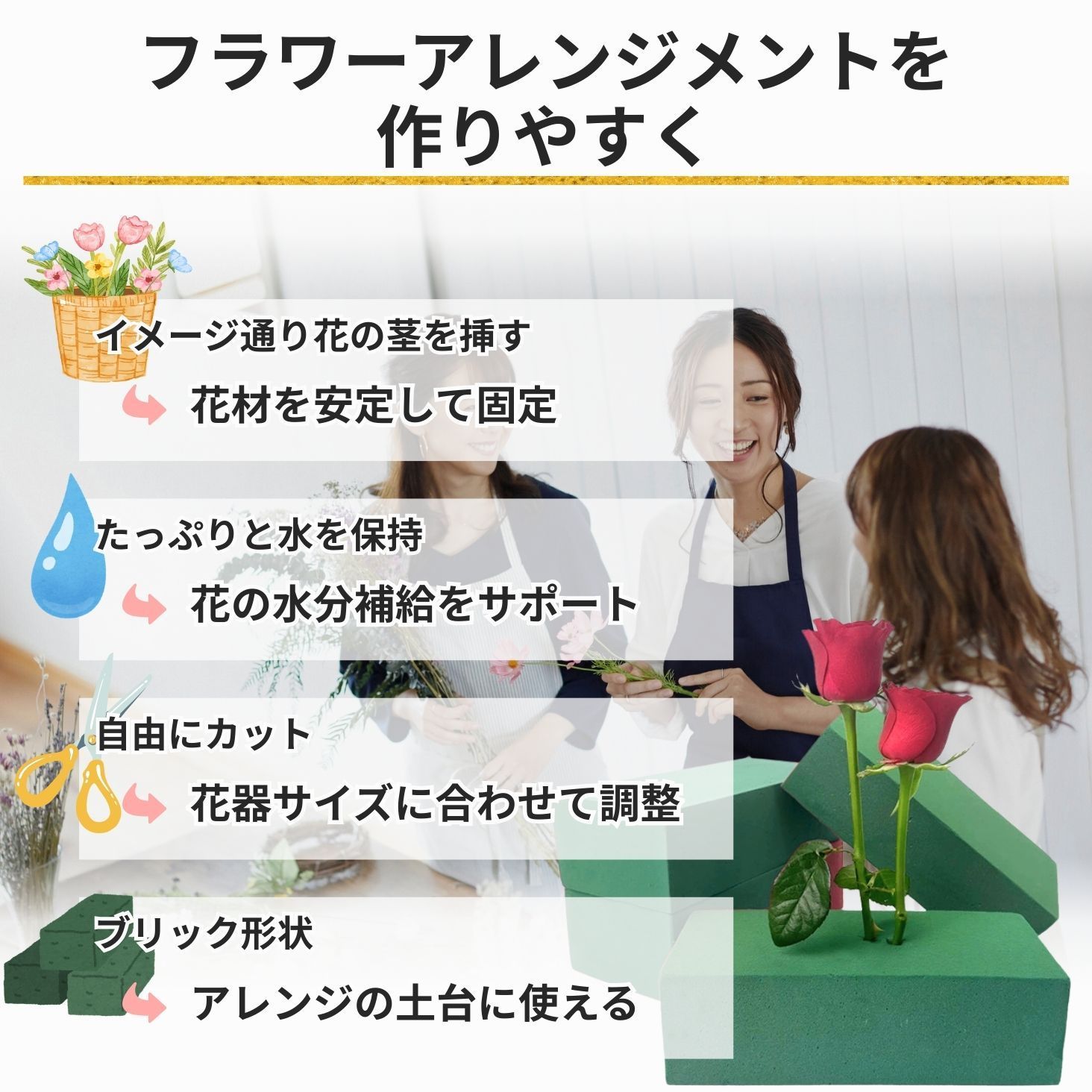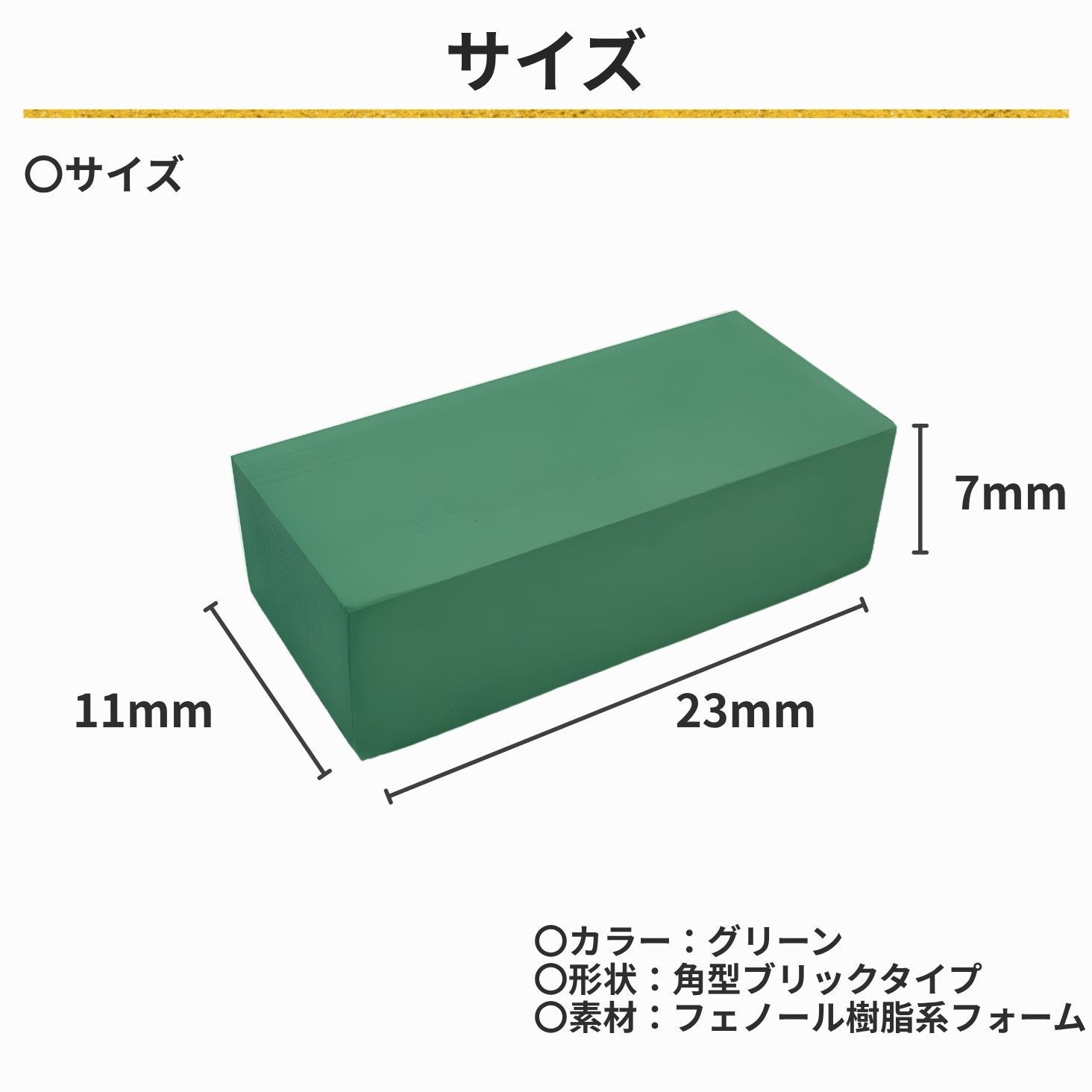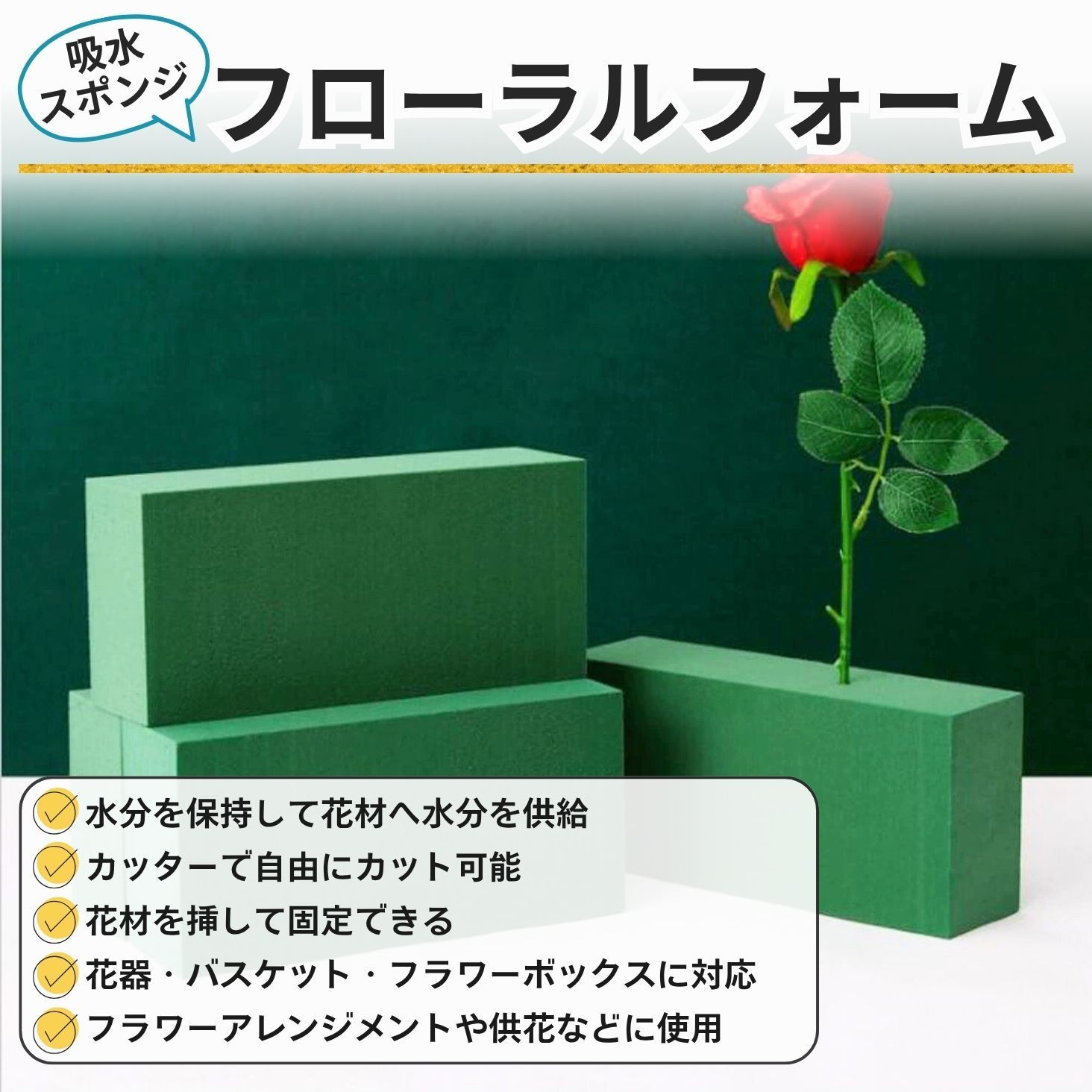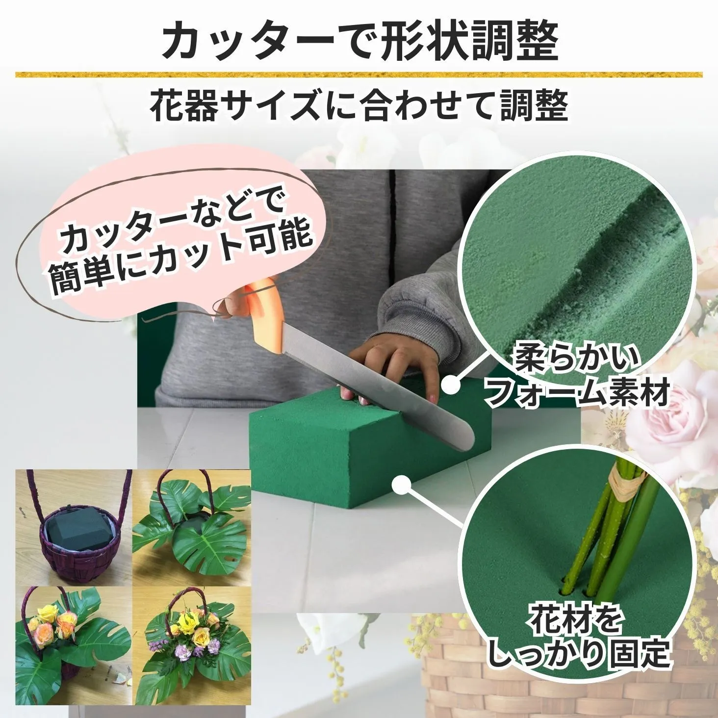 【商品内容】 〇生花の水分保持を支えるフローラルフォーム(吸水スポンジ)〇 フラワーアレンジメントの土台として使用される吸水スポンジタイプのフローラルフォームです。フェノール樹脂を主成分とした多孔質構造の素材で、水を吸収すると内部に水分を保持し、挿した花の茎へゆっくり水分を供給します。切り花の水分補給をサポートするため、フラワーアレンジメント、生花アレンジメント、花束制作、仏花、お供え花、季節の生花ディスプレイなど幅広い用途で使用することが可能です。花材をフォームに挿すことで位置を固定しやすく、花器やバスケット、フラワーボックスを使った装飾にも活用しやすいフラワー資材です。家庭での花飾りやフラワー教室、店舗の装花、イベント会場のフラワーディスプレイなどにも利用されています。 〇カットして形状調整できるブリック型吸水フォーム〇 フローラルフォームは柔らかく加工しやすい素材のため、カッターやナイフなどでサイズや形状を調整することができます。ブリックタイプ(約23cm×11cm×7cm)はフラワーアレンジメントでよく使用されるサイズで、花器やフラワーボックス、バスケットなどの容器に合わせてカットして使用できます。フォームのサイズを調整することで、フラワーギフト制作、テーブル装花、店内装飾、イベント用フラワー装飾など、用途に合わせたアレンジの土台として活用できます。花材の配置や高さを調整しながらアレンジを組み立てやすい構造のフラワーアレンジメント資材です。 〇生花アレンジメント制作に使用されるフラワー資材〇 吸水フォームは生花アレンジメントの制作に使用されるフラワー資材です。花の茎をフォームに挿して固定することで、花材の角度や配置を調整しながらアレンジを組み立てることができます。フラワーショップでのアレンジ制作やフラワーアレンジメント教室の材料として利用されているほか、家庭で花を飾る際のベース資材としても使用されています。季節の花飾り、仏壇用の供花、贈答用フラワーアレンジメントなど、様々な花装飾の制作に利用されているフローラルフォームです。水を含ませずに使用することで、造花やアーティフィシャルフラワーの固定用ベースとして使われる場合もあります。また用途の一例として、クワガタやカブトムシなどの昆虫の人工蛹室として利用されるケースもあります。