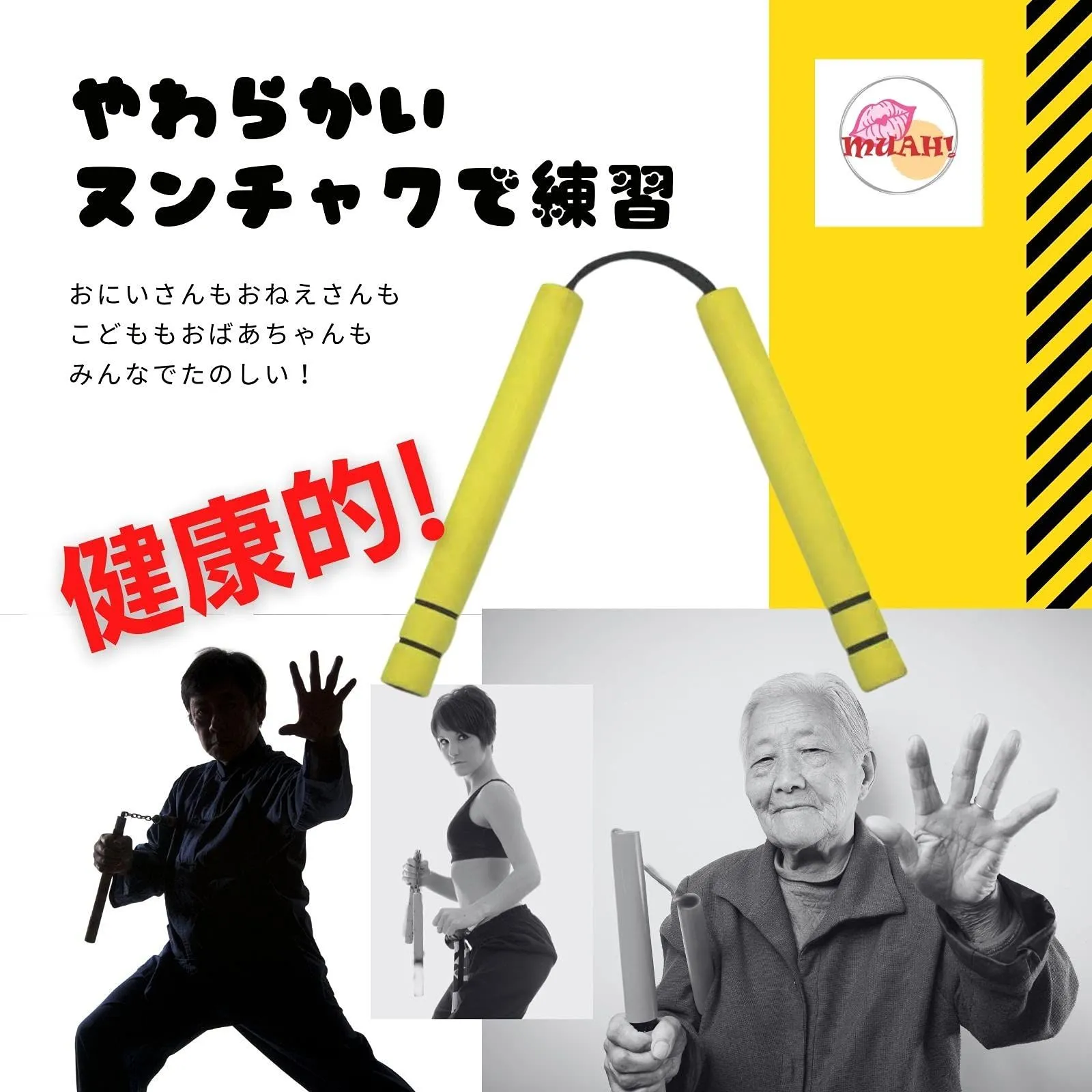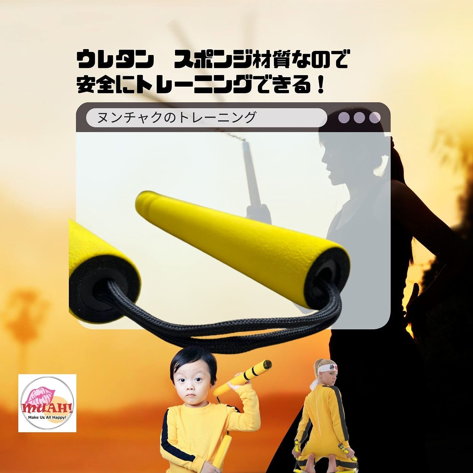 MUAH! ヌンチャク ヌントレ ダイエット 安全 軽い ウレタン 製 スポンジ 適度な 重さ 重量 初心者 練習 用 舞台 道具 黒色 黄色 ブラック イエロー 痛くない