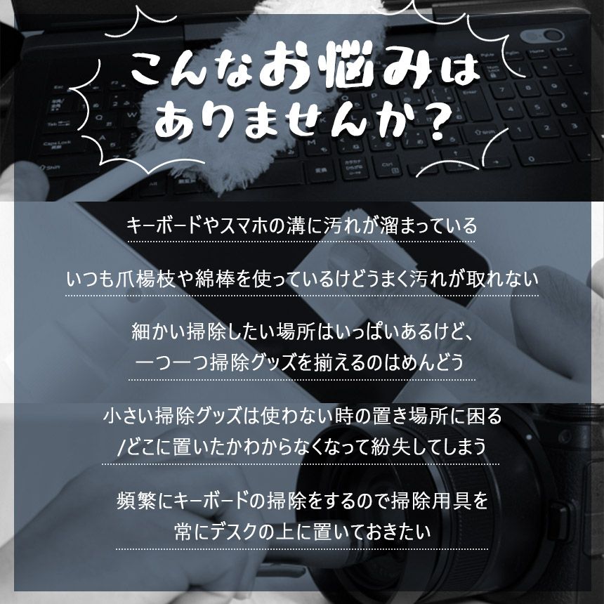 【サイズ】 本体(ケース):6×6×9cm 重量:約130g ※日本語取扱説明書、撮影用小物類などは付属しておりません。 ※簡易包装でのお届けとなります。 ※モニターにより色合いが若干違いが生じる場合がございます。 ※デザインは入荷時期により若干変化する場合がございます ※海外製造品のため、多少の匂い軽微な傷や汚れ、個体差等ある場合がございます。 ※商品の使用により生じた如何なる損害・被害も弊社では一切の 責任を負いかねますので予めご了承ください。 ※発送方法について:お届け先、個数によって配送情報に記載の配送業者とは異なる場合がございます。日本郵便、佐川急便、ヤマト運輸、またはセイノーエクスプレス(大型商品)でお届けいたします。なお、配送業者はお選びいただけませんので、ご了承ください。 [関連ワード] クリーニングツール 掃除道具 ヘッドフォン Bluetoothイヤホン Airpods 掃除キット メンテナンス用品 キーボードクリーナー ブロワー スプレーボトル 隙間 溝 ミニブラシ キープラー キーキャップ 交換 取り外し 引き抜き 付け替え スクリーン モニター コンパクト 小型 持ち運び 軽量 指紋除去 ホワイト 白 ブラック 黒