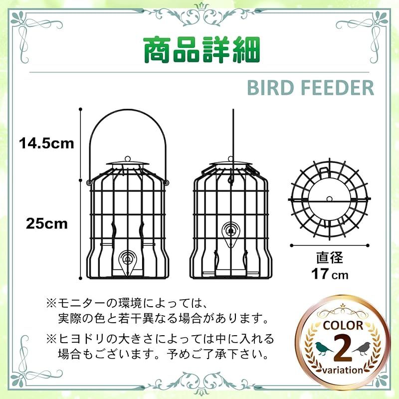 【商品説明】 バードフィーダー ヒヨドリよけ えさ台:庭でゆっくりと野鳥観察は楽しいですが、ヒヨドリに邪魔されるのは困りますよね。そんなお悩みに、ヒヨドリ対策をした、小鳥だけにエサを提供する野鳥の餌台が登場です。黒と緑の2個セットです。 一般的な鳥の餌台を設置しても、ヒヨドリが大きな声でやってきては騒ぎ立て、他の小鳥たちが近寄れない、という経験はありませんか?ヒヨドリをどうにかしたい。そんな悩みを解決するのがこのバードフィーダーです。 防護柵付きでヒヨドリ侵入を防ぎ、小鳥たちの安心空間を実現。約3cmの格子で、小鳥が快適に食事を楽しめる設計。エサ補充も簡単。メジロ、シジュウカラ、ヤマガラなど、小鳥たちが安全に食事を楽しめるます。 サイズとカラー:25cm(底から取手まで)、取手14.5cm x 幅17cm ブラックとグリーンの2色 ※モニターの環境によっては、実際の色と若干異なる場合があります。※ヒヨドリの大きさによっては中に入れる場合もございます。 推奨事項:容器を清潔に保つため定期的な掃除。穀物をたくさん入れすぎると詰まる原因になります。エサの上は屋根付きですが、大雨等の場合水の侵入で餌が腐る場合もございます。設置は雨で濡れない所がおすすめです。