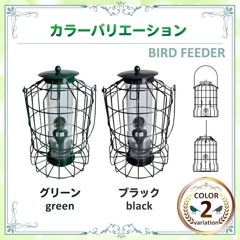 【商品概要】 バードフィーダー ヒヨドリよけ えさ台:庭でゆっくりと野鳥観察は楽しいですが、ヒヨドリに邪魔されるのは困りますよね。そんなお悩みに、ヒヨドリ対策をした、小鳥だけにエサを提供する野鳥の餌台が登場です。緑のエサ台です。 一般的な鳥の餌台を設置しても、ヒヨドリが大きな声でやってきては騒ぎ立て、他の小鳥たちが近寄れない、という経験はありませんか?鳥餌台に来るヒヨドリをどうにかしたい。鳥のエサがみんな食べられてします。そんな悩みを解決するのがこのバードフィーダーです。こちらは 野鳥 餌入れ 屋外用です。 鳥のえさ台は、防護柵付きでヒヨドリ侵入を防ぎ、小鳥たちの安心空間を実現。約3cmの格子で、小鳥が快適に食事を楽しめる設計。エサ補充も簡単。メジロ、シジュウカラ、ヤマガラなど、小鳥たちが安全に食事を楽しめるバードフィーダー 屋外です。 バードフィーダー オクガイのサイズとカラー:25cm(底から取手まで)、取手14.5cm、幅17cm ブラックとグリーンの2色 ※モニターの環境によっては、実際の色と若干異なる場合があります。※鳥のえさだいは、ヒヨドリの大きさによっては、鳥のえさだいの中に入れる場合もございます。また、ヒヨドリより小さいムクドリの場合も同様となります。 推奨事項:バードフィーダー 吊り下げは、容器を清潔に保つため定期的な掃除。穀物をたくさん入れすぎると詰まる原因になります。エサの上は屋根付きですが、大雨等の場合水の侵入で餌が腐る場合もございます。設置は雨で濡れない所がおすすめです
