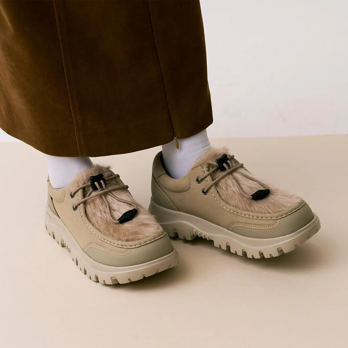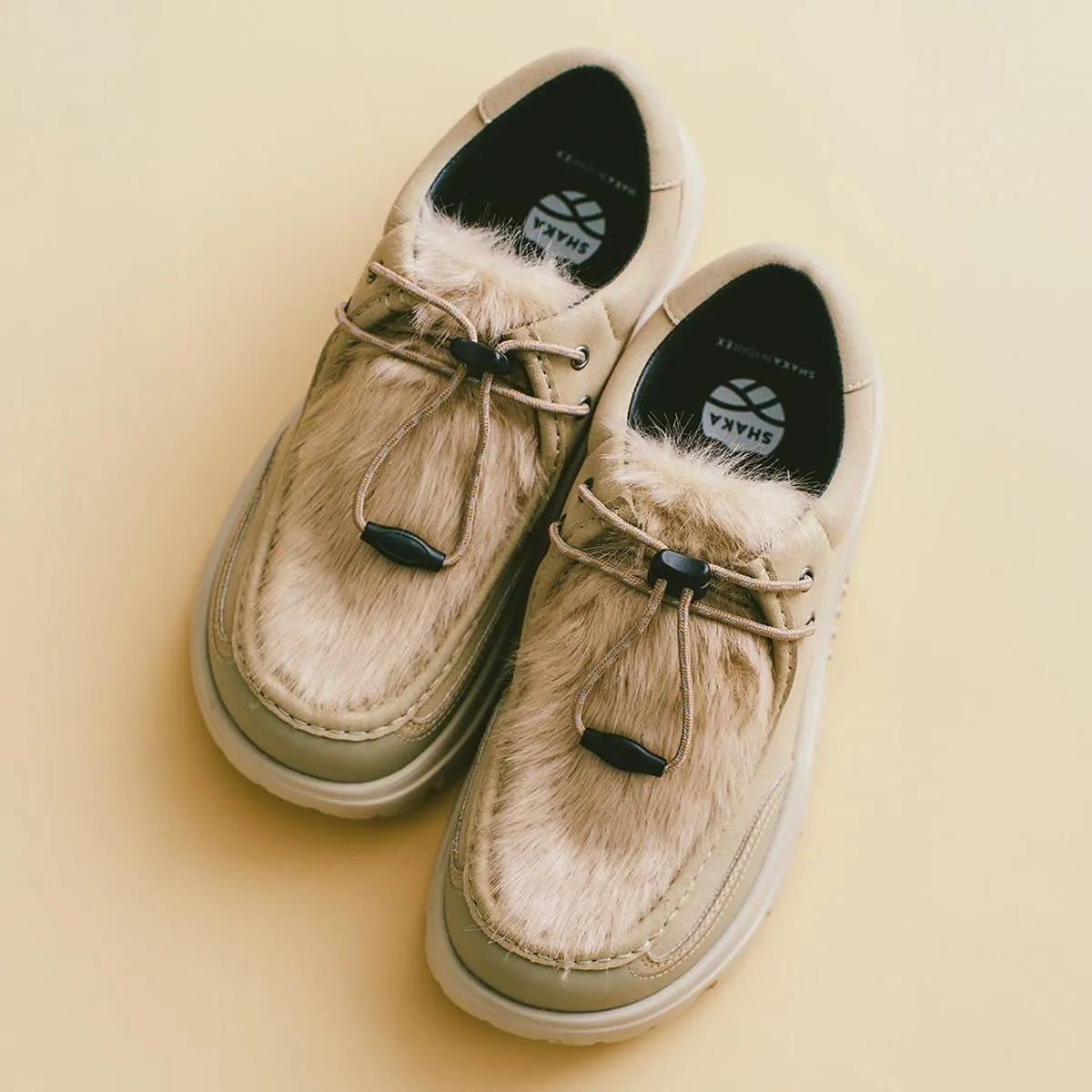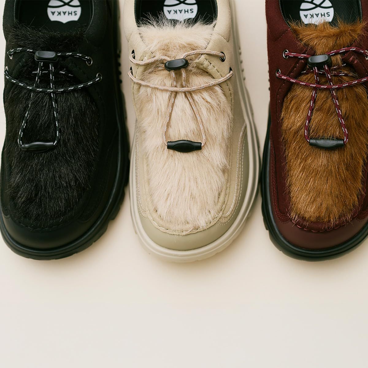 【デザインと機能性が融合】アッパーにはエコに配慮したフェイクファー、撥水加工の「3M Scotchgard (3M スコッチガード)」を施し、さらに見た目にもデザインポイントになっているつま先と踵に弾力性と耐久性のあるTPUマッドガードを付けることで晴れた日の街履きにはもちろん、普段使いに高い実用性を誇ります。中敷き(インソール)には、EXソールシリーズ用に開発された「SHAKA IN-FOAM EX (シャカインフォームEX)」を採用。高い衝撃吸収性と反発性を両立して快適な履き心地を実現しました。