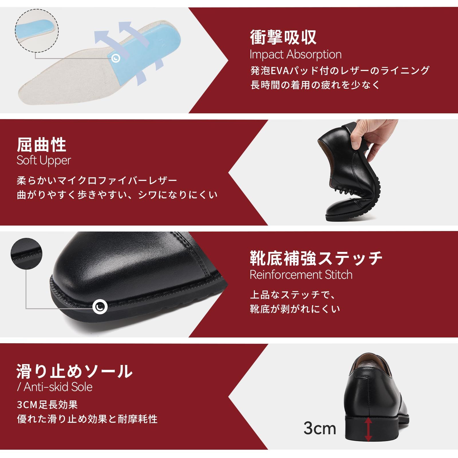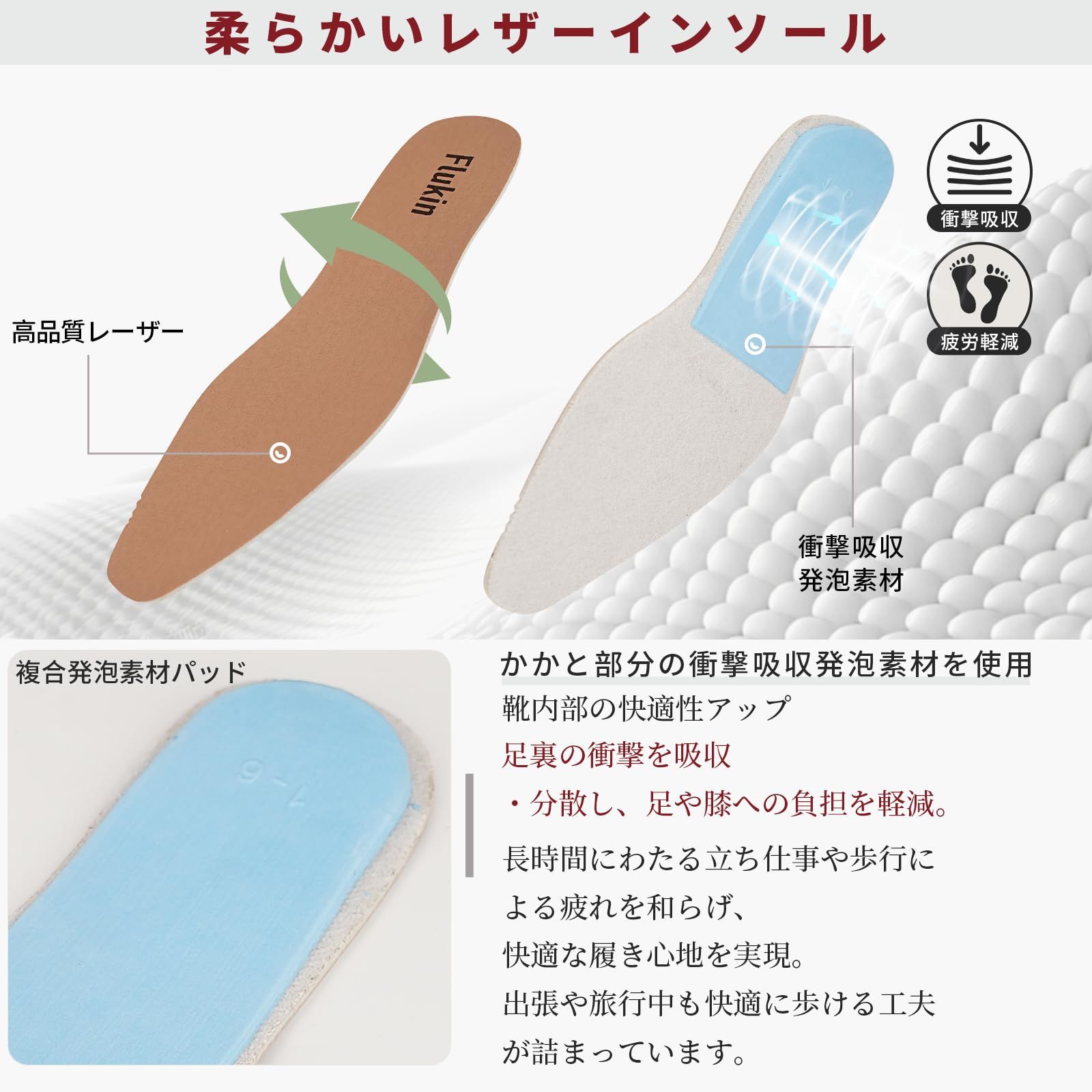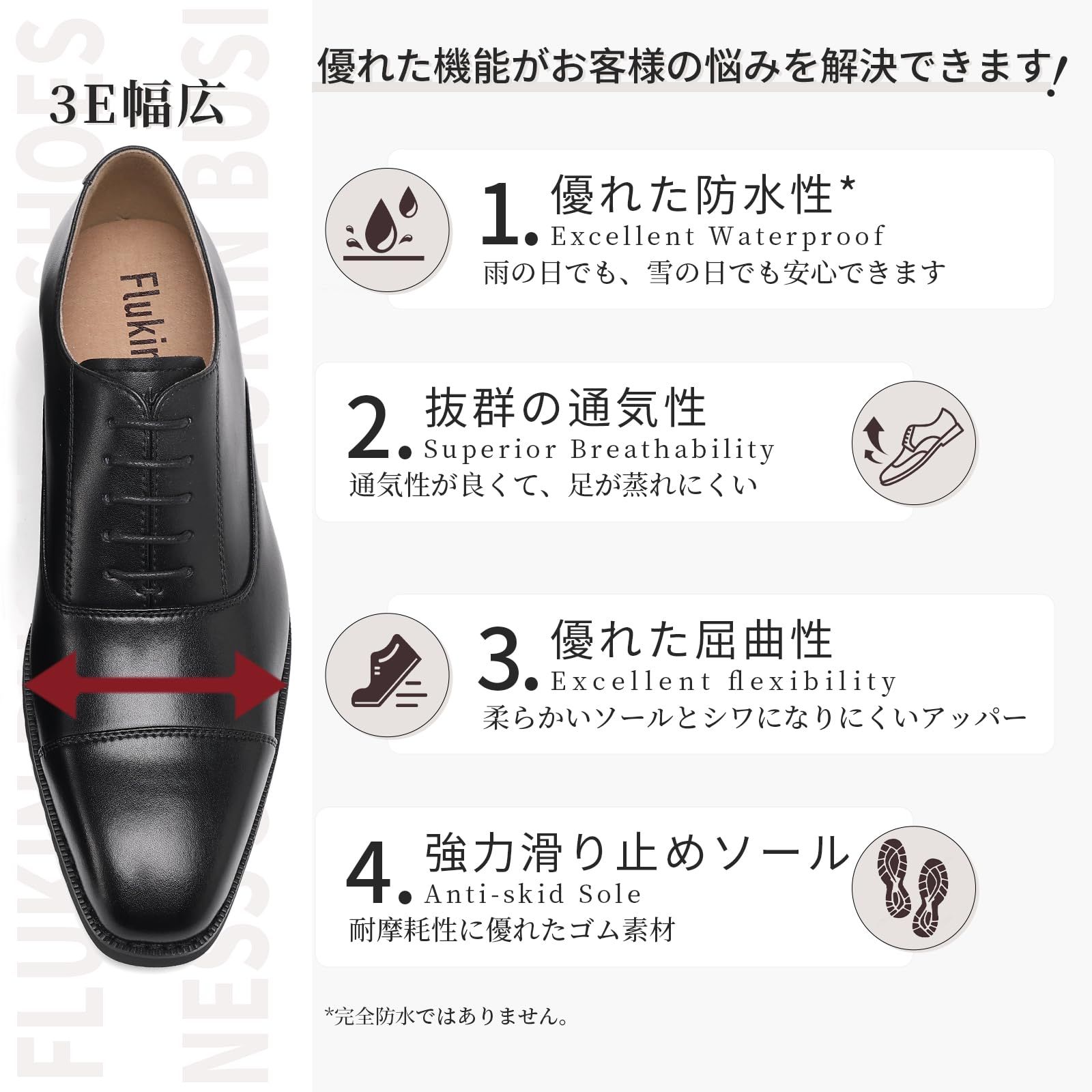 【雨の日も安心の優れた防水性・通気性】表面に撥水加工を施した高品質なマイクロファイバーレザーを使用し、突然の雨や雪の日でも靴内部をドライに保ちます。優れた防水性と抜群の通気性を両立させ、暑い日や長時間の着用でも蒸れによる不快感を大幅に軽減します。本革に近い質感を持ちながら汚れに強く、日々のお手入れが簡単なため、忙しい毎日を強力にサポートします。 ゴム強化ソールを採用し、優れたグリップ力を発揮。雨の日や滑りやすい路面でもしっかりと地面を捉え、安全な歩行をサポート。 軽量で柔軟性があり、足の動きに自然にフィット。長時間の歩行でも快適な履き心地を提供する高機能ソール。 快適な3Eワイド設計により、足幅の広い方でもゆったりとした履き心地を実現。 余裕のあるフィット感で、長時間の着用でも圧迫感なく快適に歩行できます。 王道のストレートチップ(内羽根式)つま先に横一文字のラインが入った「ストレートチップ」を採用。冠婚葬祭から重要な商談まで、あらゆるフォーマルシーンで「最も信頼される足元」を演出します。 最後までご確認頂き誠にありがとうございました。 上記をご確認頂き、ご購入いただけましたら幸いです。 何かご不明な点がございましたらお気軽にメッセージからお問い合わせ下さい。