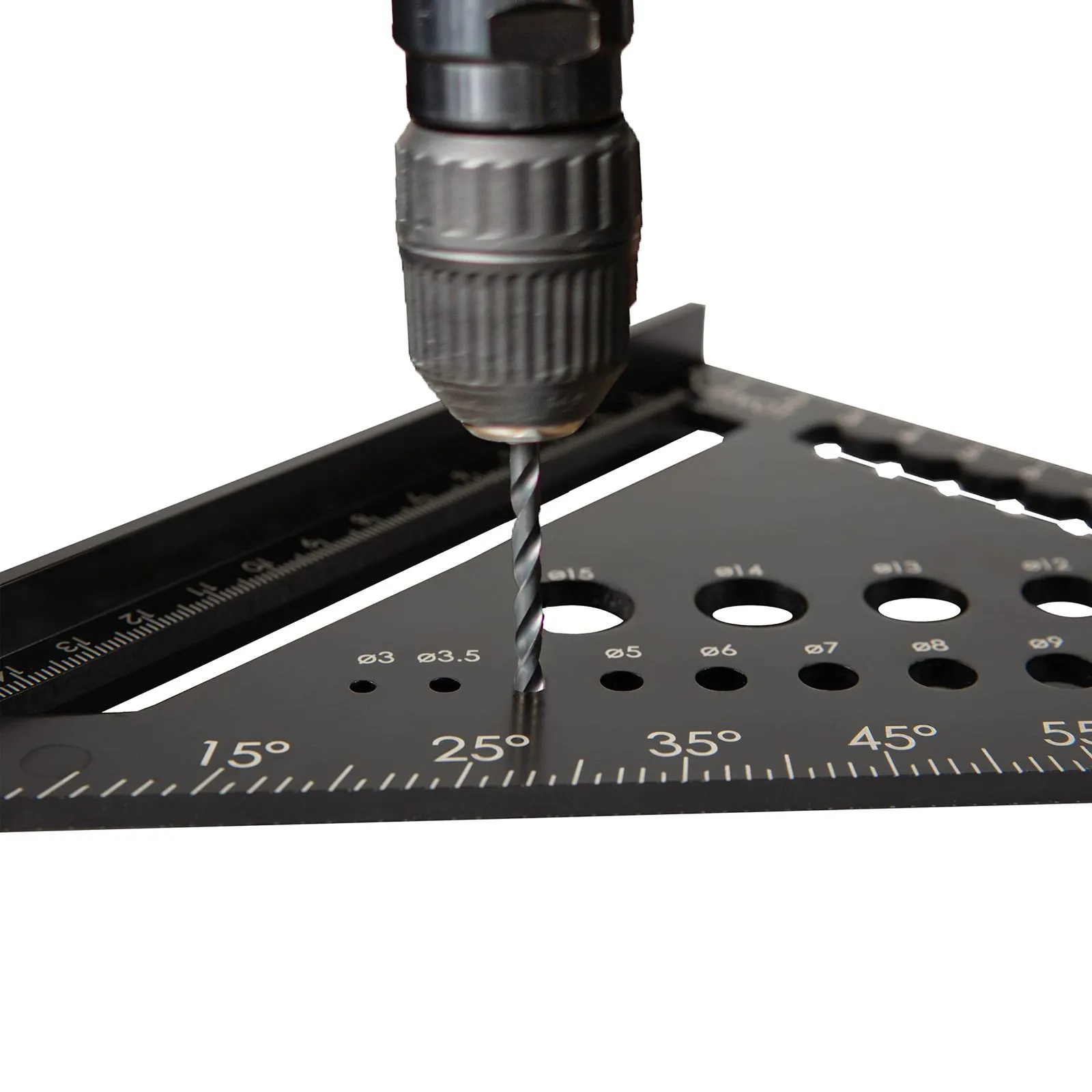 18cm以内の長さ測定のほか、直線、角度や丸形も描けます。直径3mmから15mmまで14個の穴があり、穴あけるとき、ドリルガイドとしても使用可能です。