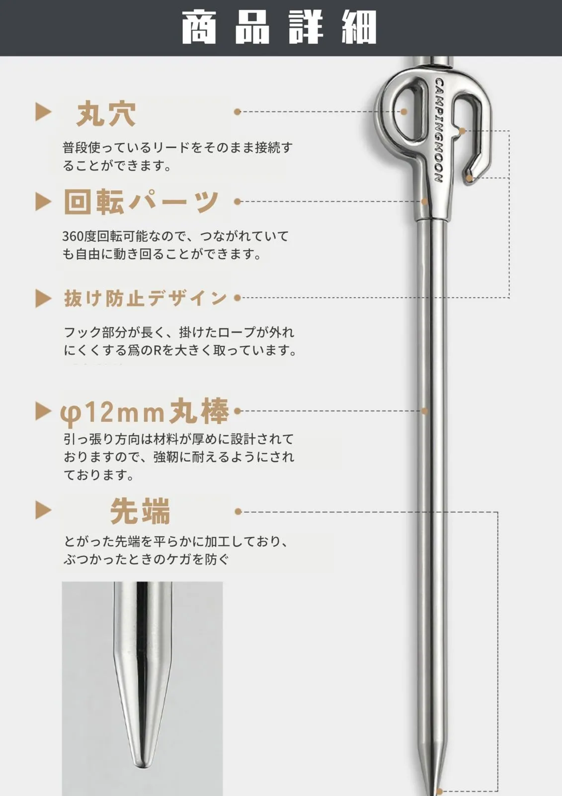 キャンピングムーン(CAMPING MOON) 係留用ポール 係留用ペグ ペット 小型犬用 ステンレス鋼420製 30cm 固い地面にも打ち込める 360度回転 K45-30