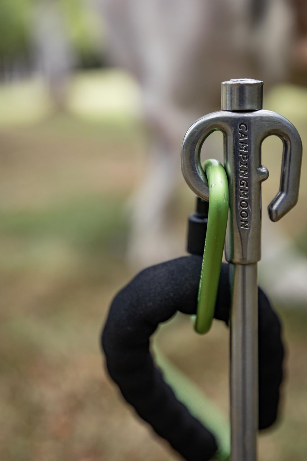 お手持ちのハンマーで地中深くに打ち込んで固定。 普段使っているリードをそのまま装着可能。