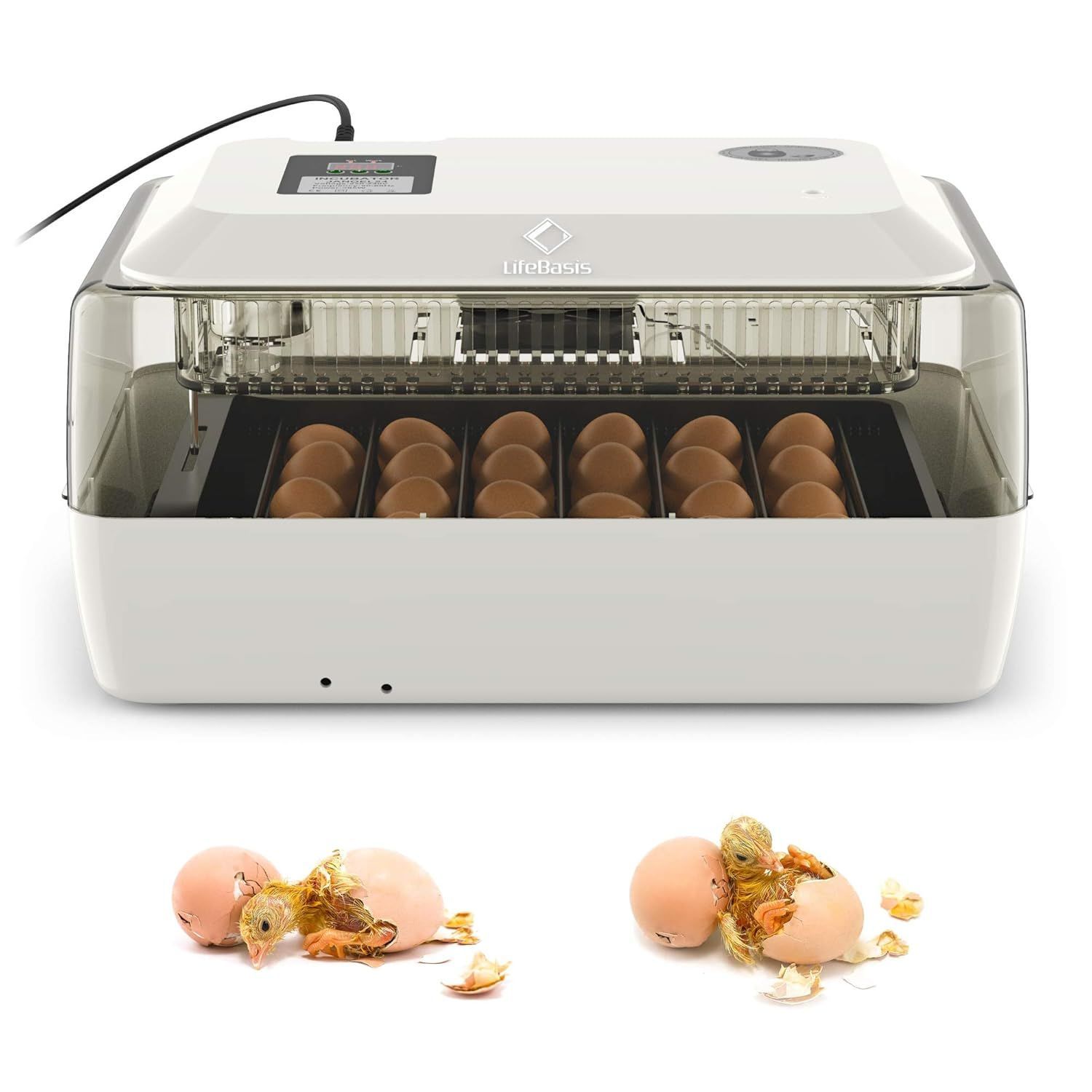 【大容量な全自動孵卵器】毎回24個ニワトリサイズの卵を孵化できる超大容量な全自動孵卵器です。一定の温度で保温する機能と自動転卵機能があります。全自動孵卵器で皆さんおなじみ人工孵化初心者でも使いやすいです。