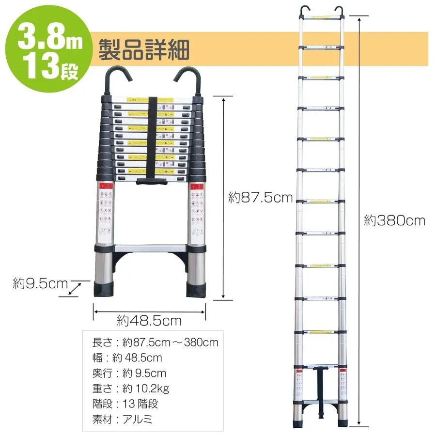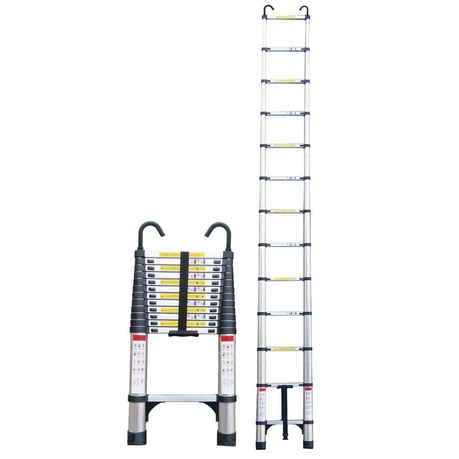 伸縮はしご 梯子 はしご 3.8m 伸縮 アルミ フック付き スライド式 ハシゴ 安全ロック 屋根用 折りたたみ
