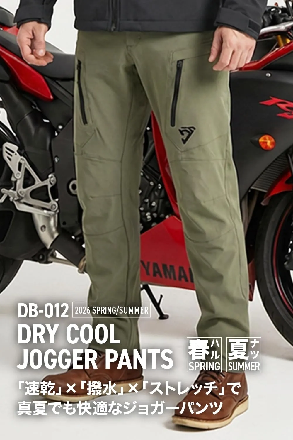 高伸縮性の生地とジョガーシルエットが脚に自然にフィットし、ツーリングから街中の散策まで快適な履き心地を実現