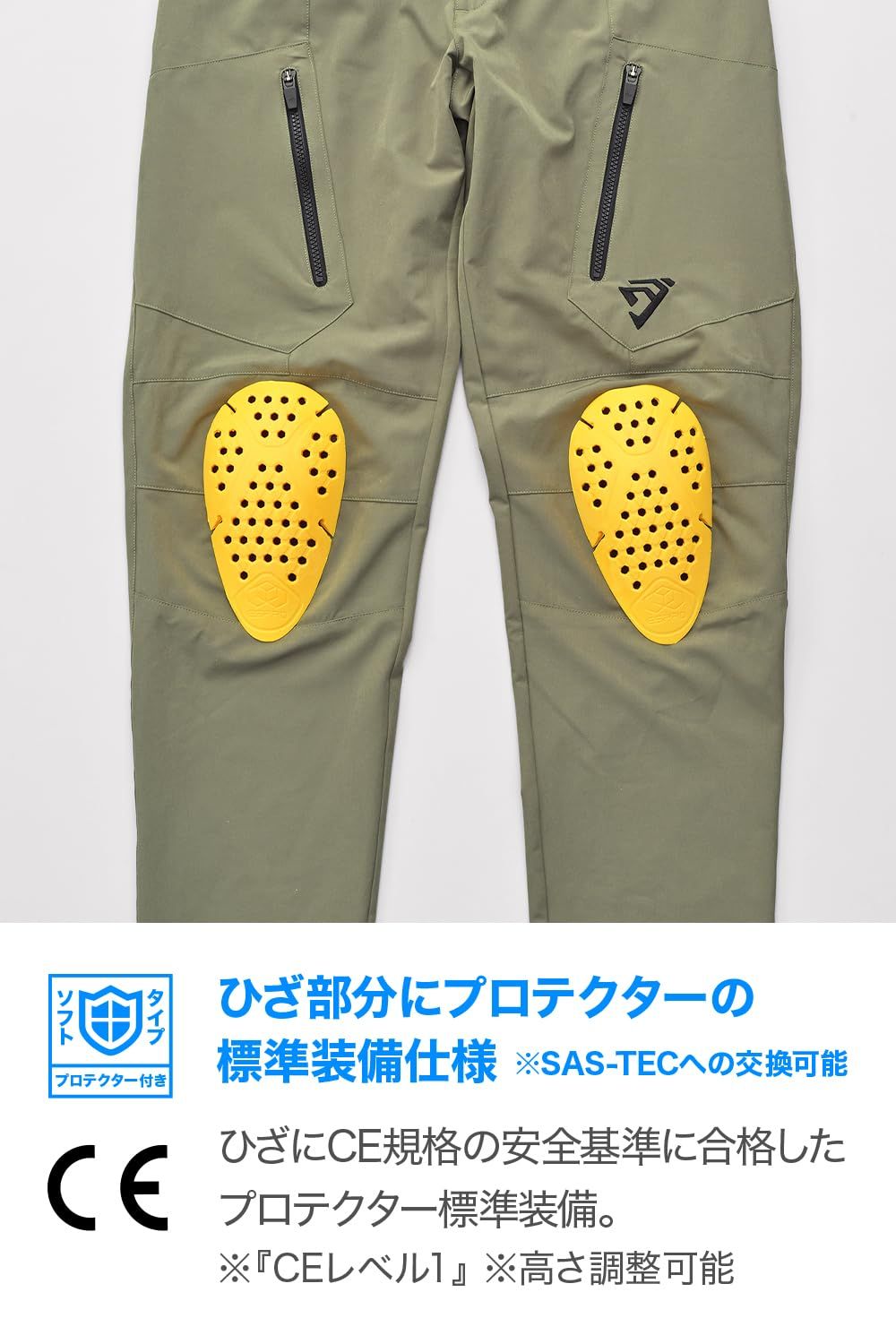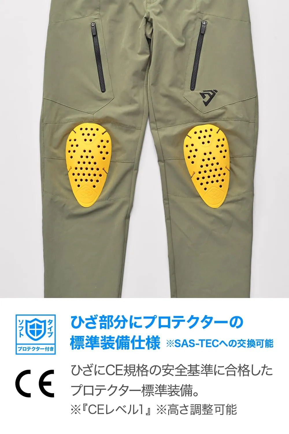 CE規格プロテクター付属:ひざ(LV1)。プロテクターポケットは高さの調整が可能