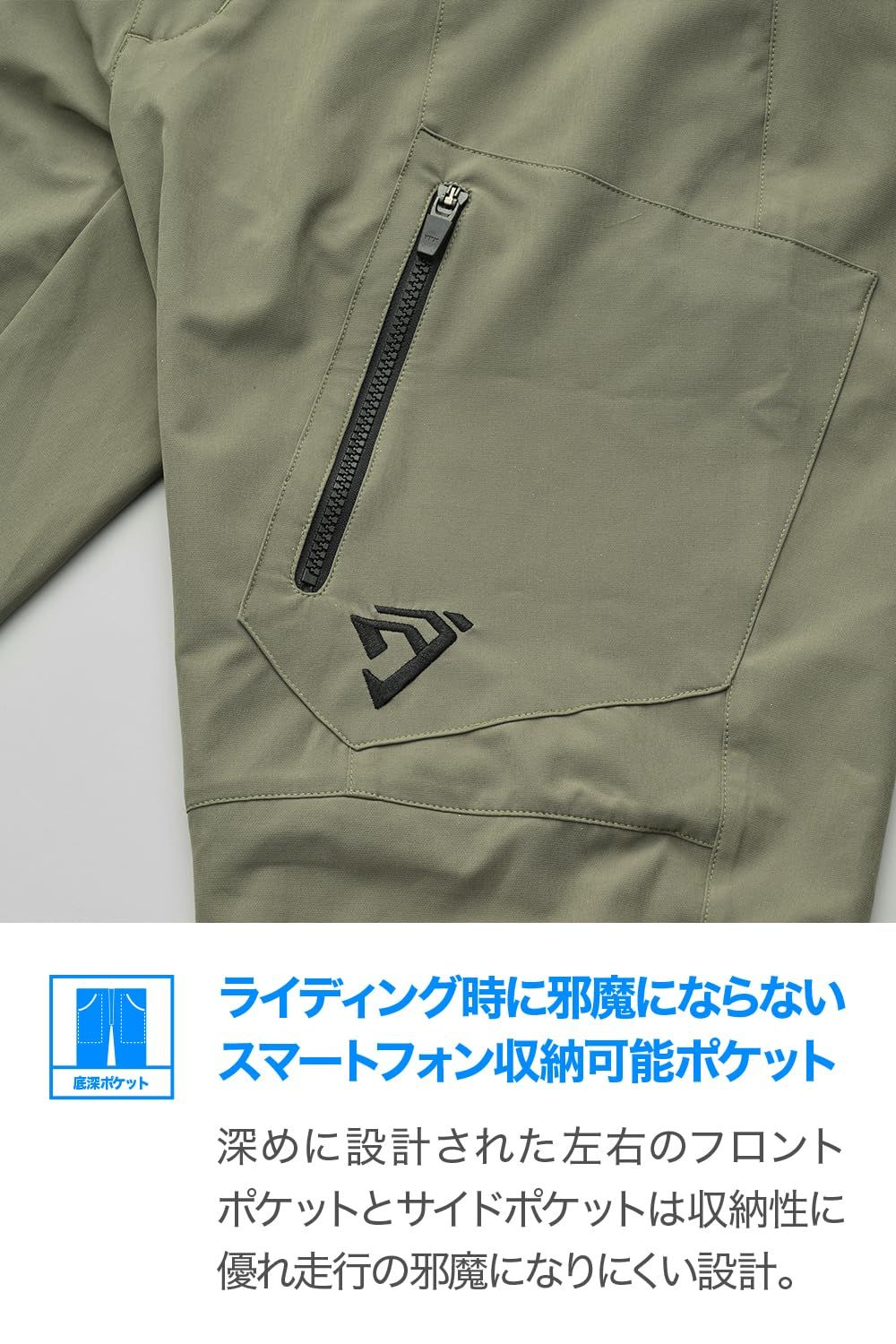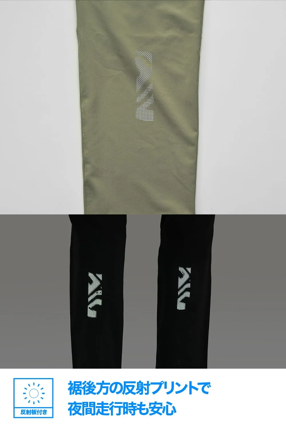 深めに設計されたフロントポケットと大型サイドポケットは収納性に優れ、走行の邪魔になりにくい。裾後方の反射プリントにより視認性を確保し、夜間の移動も安心。