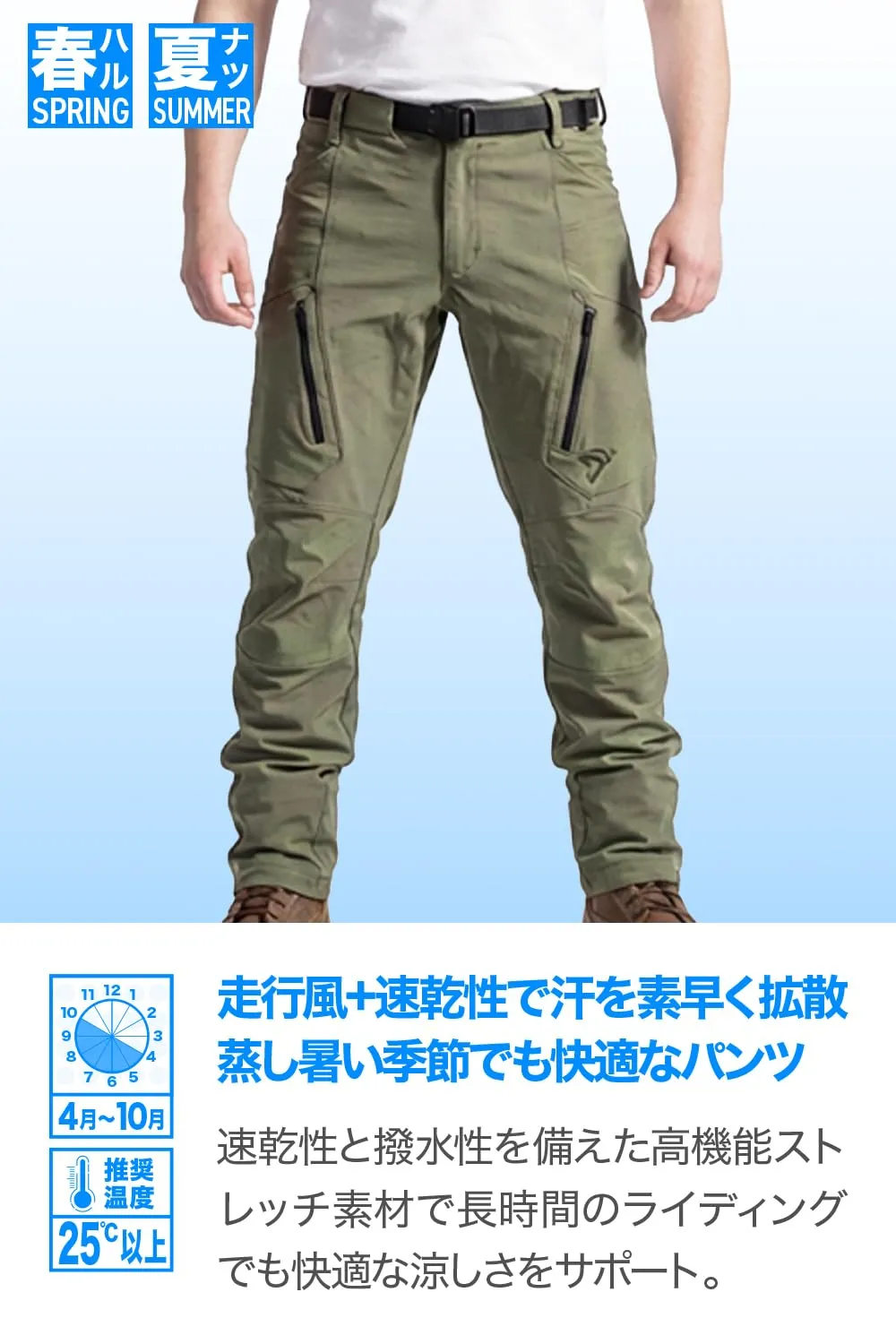 撥水性と速乾性を備えた高機能ストレッチ素材を採用したタクティクールジョガーパンツ。乗車時の動きを妨げず、肌離れが良いためベタつきにくく、汗ばむ状況でもさらりと快適な着用感を持続。