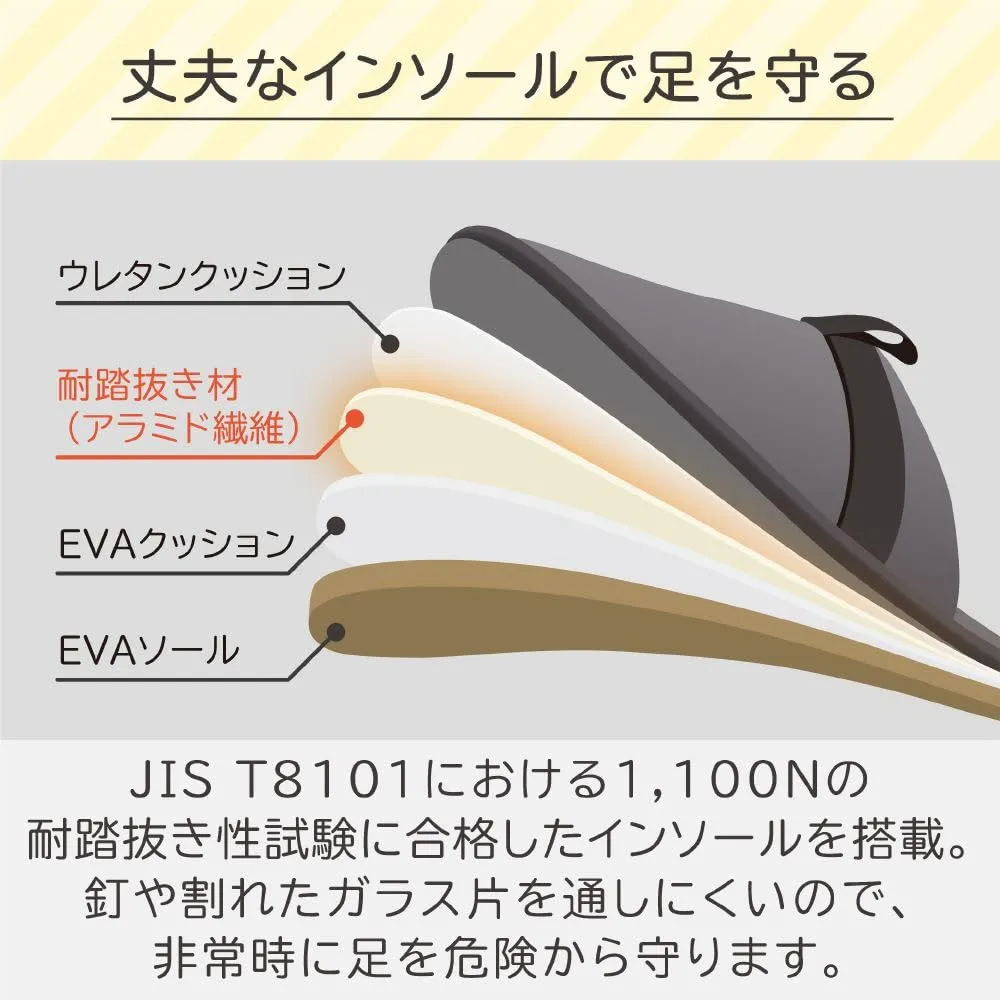 ●踏抜きを防止する丈夫なインソールを採用 底面にはJIST8101における1100Nの対踏抜き性試験に合格したインソールを採用しており、災害時に落下物やガラス片などの危険から足を守ります。 足裏は滑りにくいEVA製なので災害時の避難でも安心です。