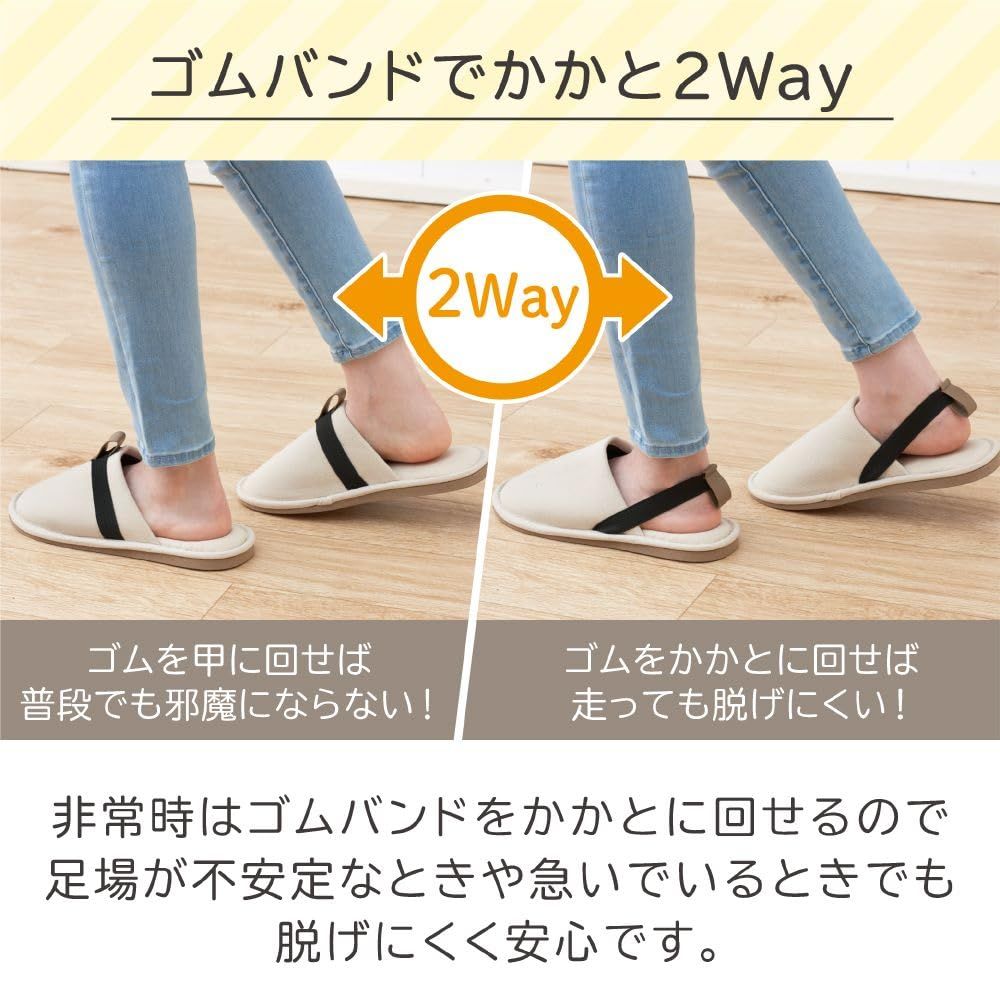 ●非常時にも安心のかかと2Way 日常時には邪魔にならず、非常時にはスリッパを脱げにくくする、かかと2Way仕様です。 普段はゴムバンドを甲に固定しておけばスムーズに脱ぎ履きでき、非常時にはゴムをかかとに回して足場が不安定なときや急いでいるときでも脱げにくく安心です。