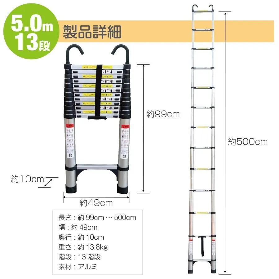 【商品サイズ】 全長5.0m 最大全長:500cm 収納時:約99*49*10cm 商品重量:約13.8kg 階段数量:13段 耐荷重:150kg 素材:アルミ 注意事項 ※ケガ防止のため、ロック状態を確認した上でのご使用をお願いします。 ※足元が不安定な場所などでのご使用はおやめください。 2階の外壁、窓、屋根のお掃除はもちろん、 電球の交換など幅広くお使いいただけます。 段落ちしない安全ロック付きで安心です◎