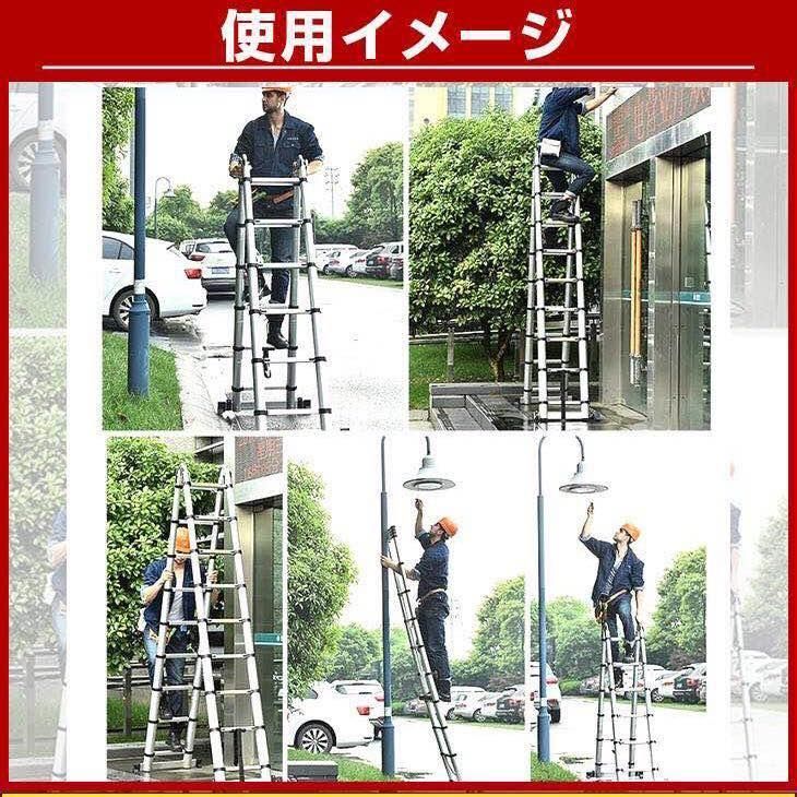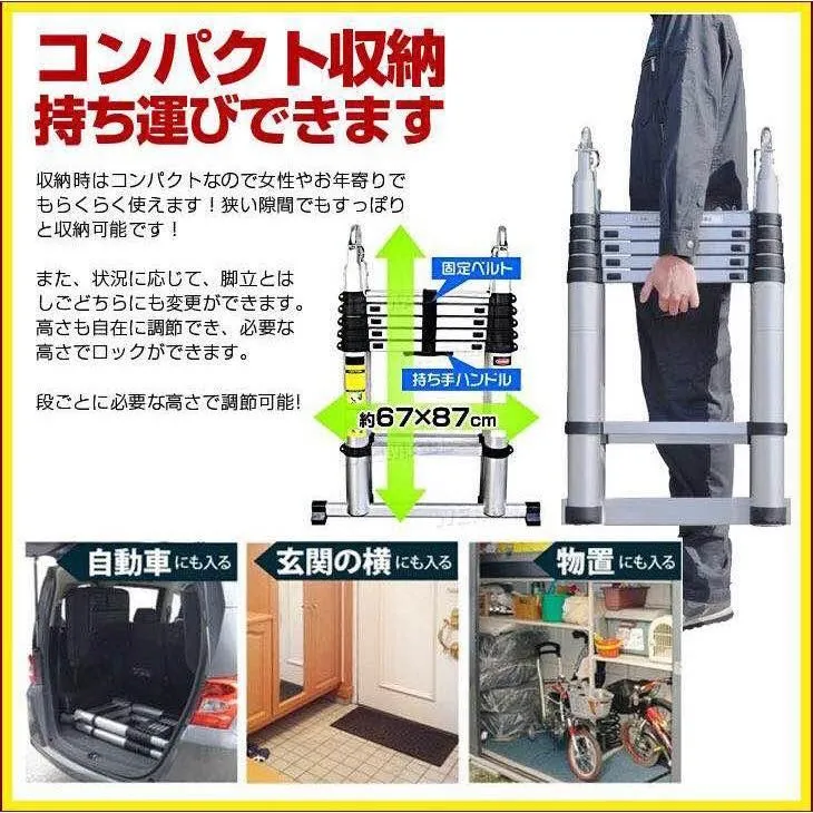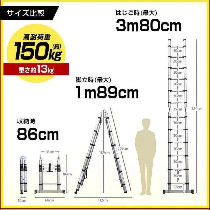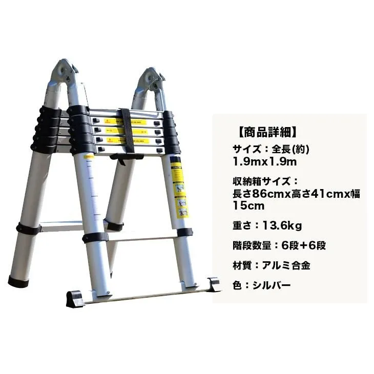 【安心の1年間保証】 商品仕様:最大全長:380cm 脚立サイズ:190cm 収納時:86*49*17cm 商品重量:約13.6kg 階段数量:6段+6段 耐荷重:150kg 素材:アルミ(連結部分:スチール) 商品特徴:伸縮折りたたみはしご3.8m