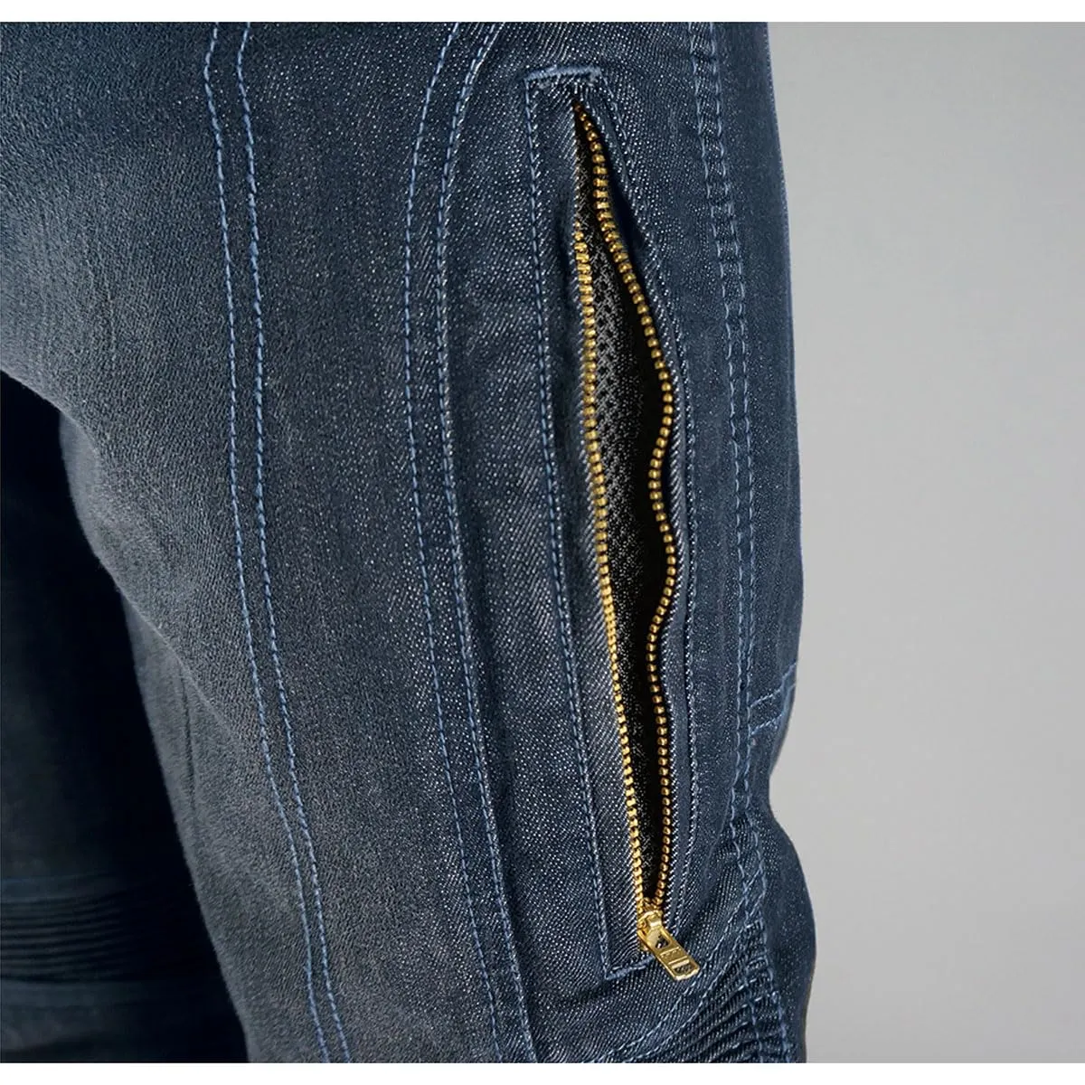 ストレッチデニムと伸縮シャーリングで抜群のフィット感と動きやすさ。さらに高強度繊維ケブラーR をヒップと膝の裏地に使用。膝にはレベル2CE規格プロテクターを着脱しやすい外入れ式で装備。膝プロテクターはハードタイプ(SK-635/別売)も使用可能