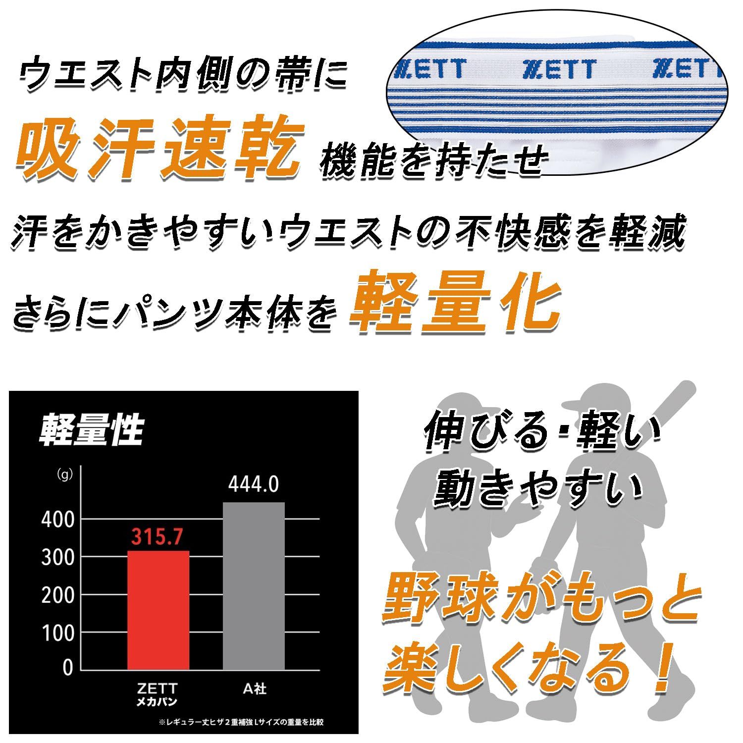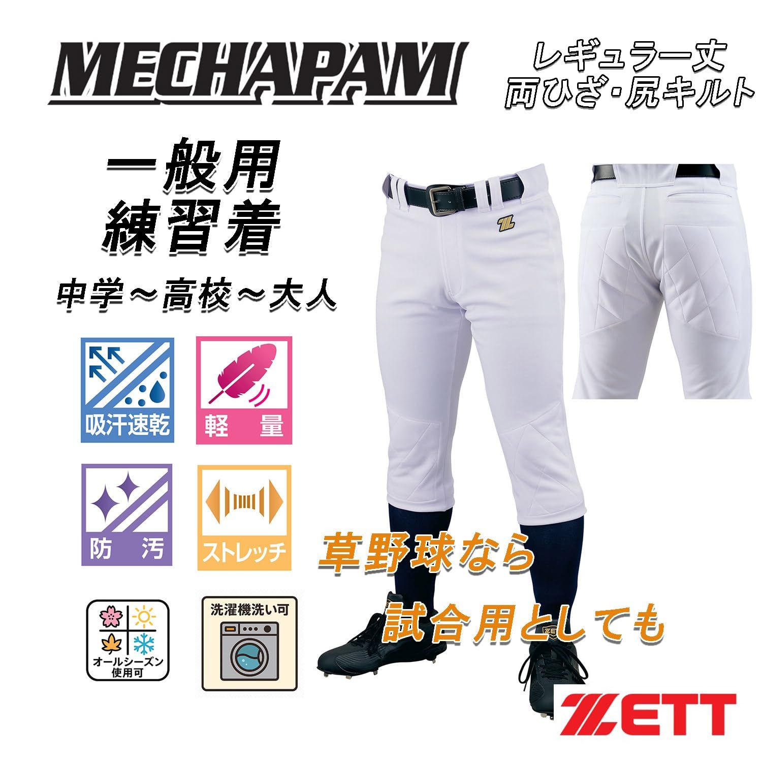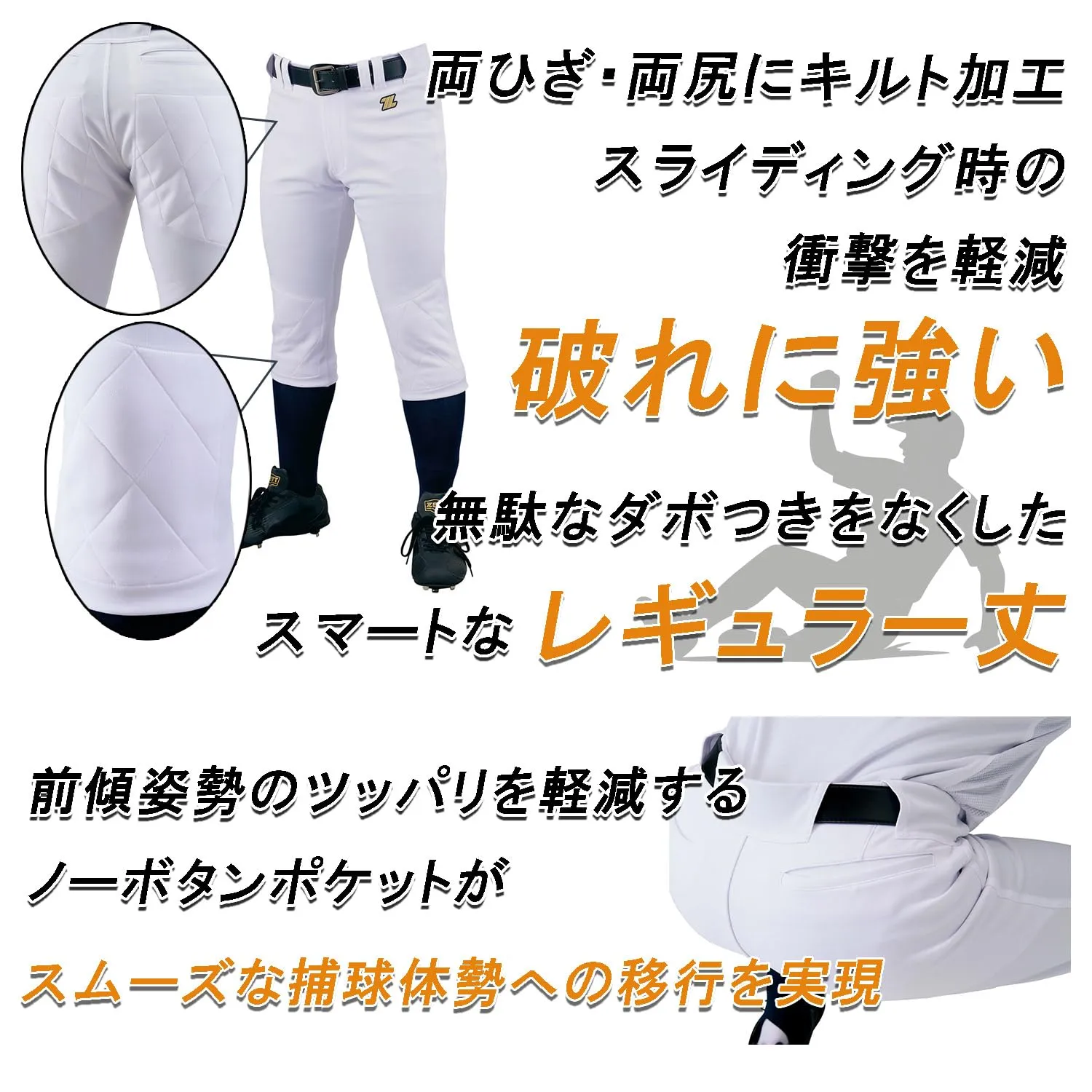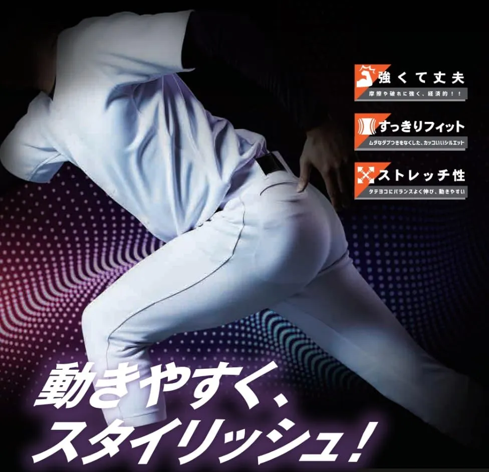 仕様:ヒザキルト、尻キルト、前傾姿勢のツッパリを軽減するノーボタンポケット、吸汗速乾マーベルト