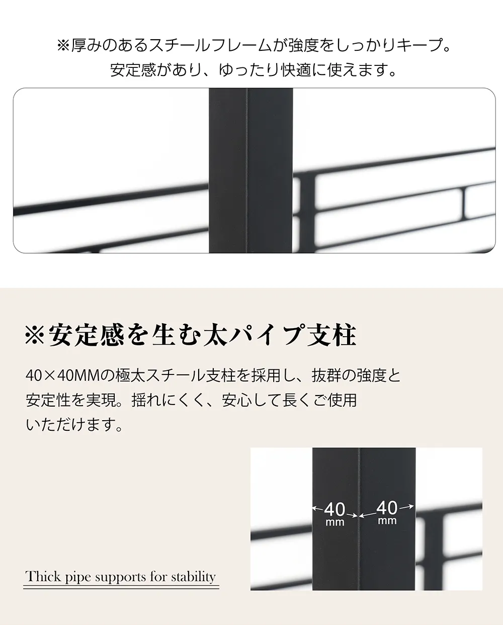 安定感を生む太パイプ支柱40×40mmの極太スチール支柱を採用し、抜群の強度と安定性を実現。揺れにくく、安心して長くご使用いただけます。