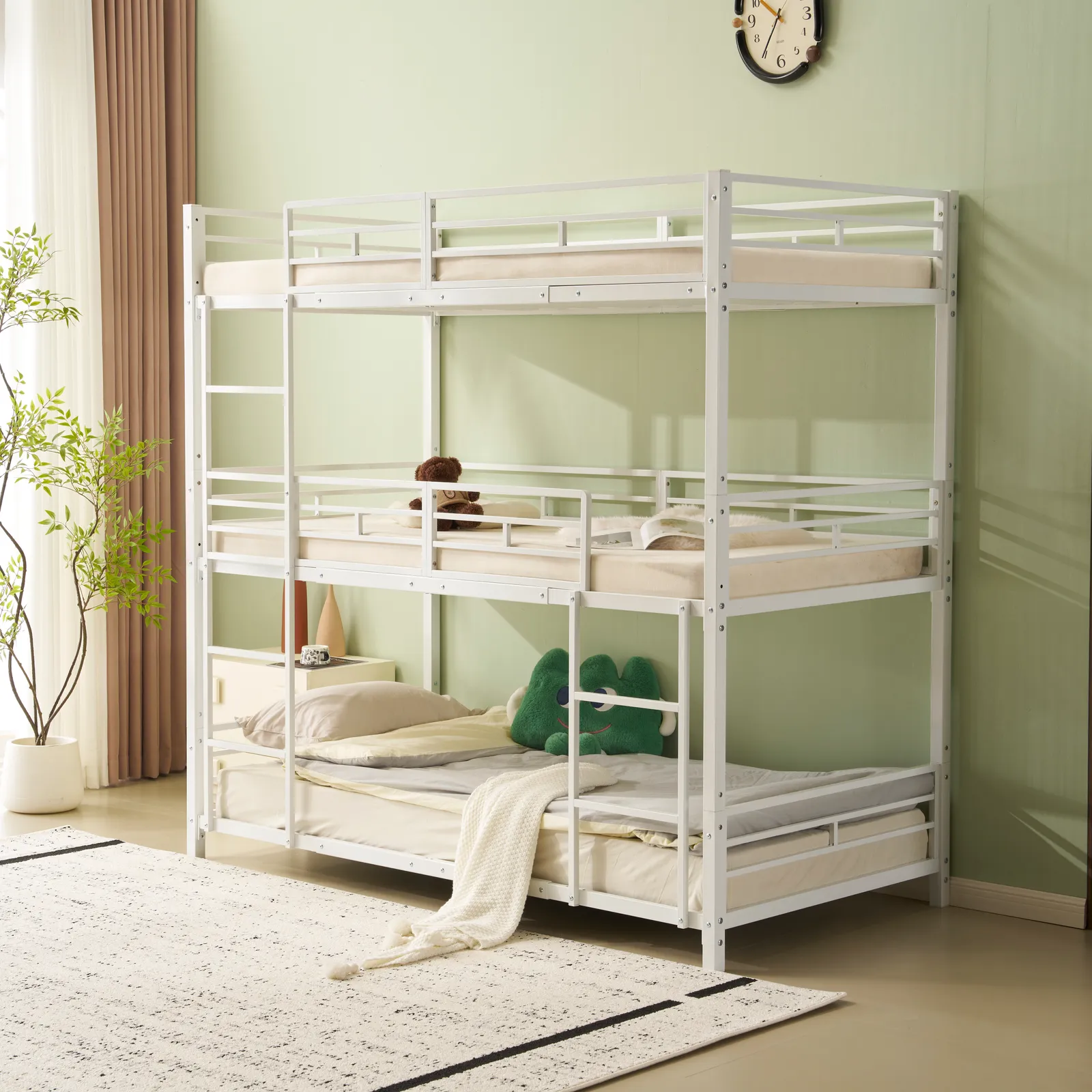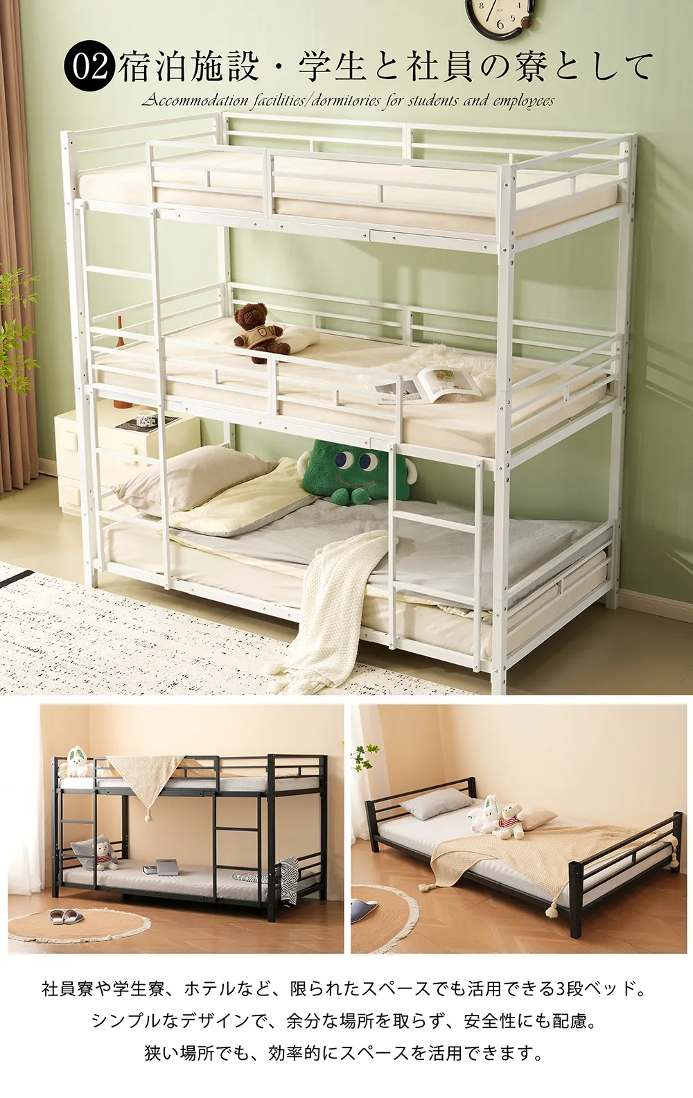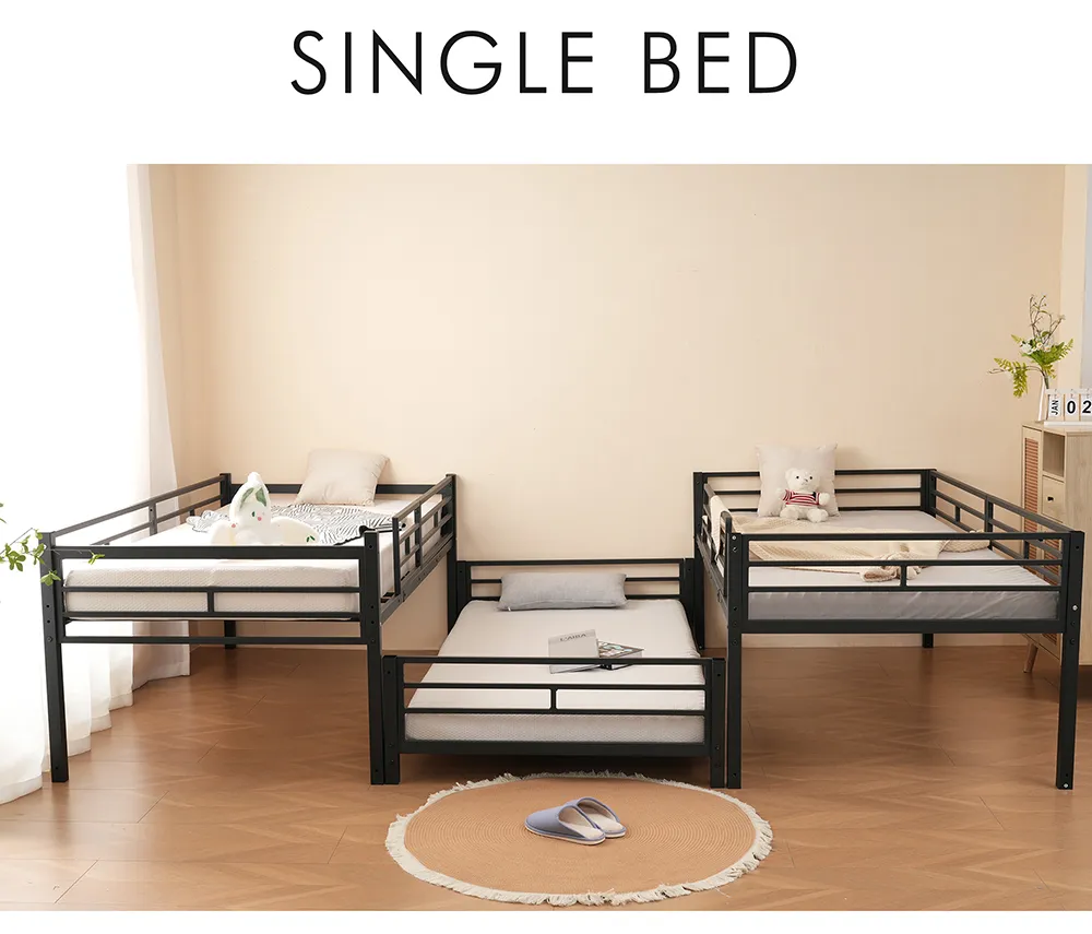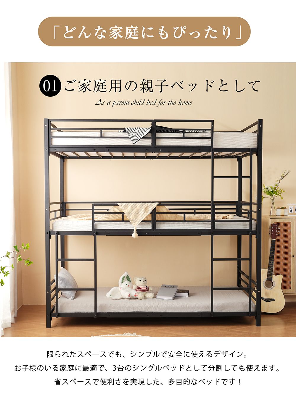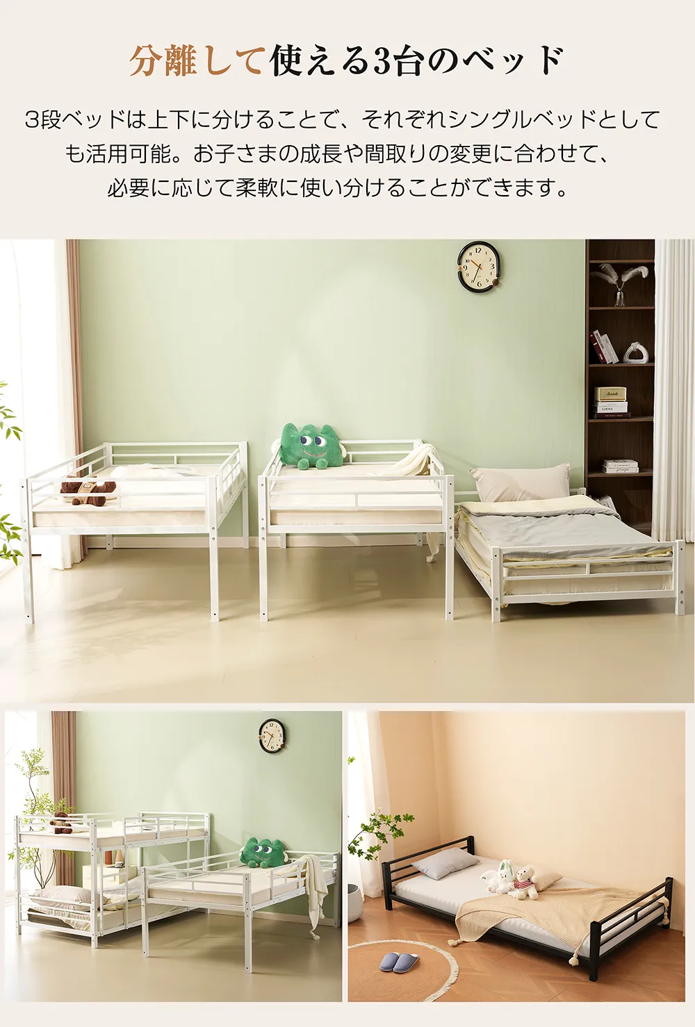 柔軟性と多機能性、配置の自由度3段ベッドは上下に分割でき、3つのシングルベッドとしても使用可能。子供の成長に伴いお部屋を別々にする際も、そのまま3つのベッドとして利用できるため、便利な家具として長く使えます。柔軟性があり、将来のニーズに適応し、家族構成の変化に対応できるため、多くの家庭で重宝されています。ベッドが分割可能なため、部屋のレイアウトを自由に変更でき、スペースを有効活用できることで、部屋の使い勝手が向上します。