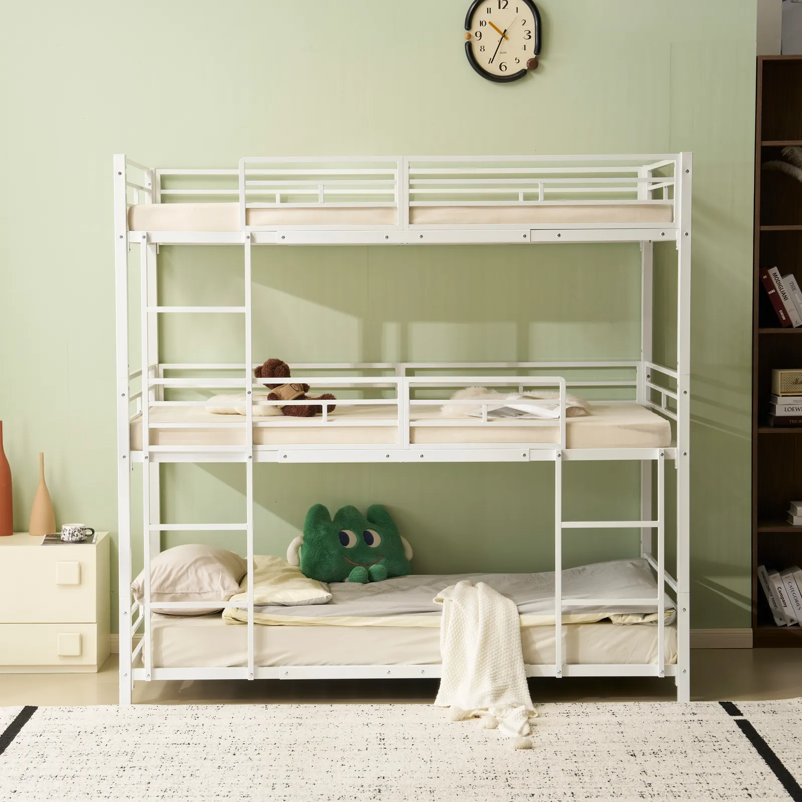 省スペースな垂直はしご、左右前後自由に変更3段ベッドはスペースを最大限に節約し、広くない家庭や学生・社員寮などでの使用に最適です。省スペースな垂直はしごも、斜めに置いたはしごに比べて場所を取らず、余分なスペースを削減します。はしごは、部屋のレイアウトに応じて自由に変更でき、左右や前後に置くことができます。