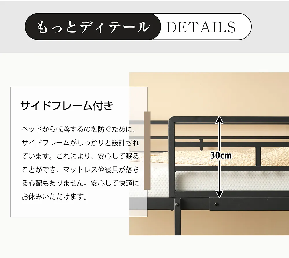 サイドフレーム付くベッドからの誤っての落下を防ぐために、サイドフレームが設計されており、より安心して眠ることができます。マットレスや布団などの寝具もしっかり固定されており、安定した睡眠を心地よく楽しむことができます。
