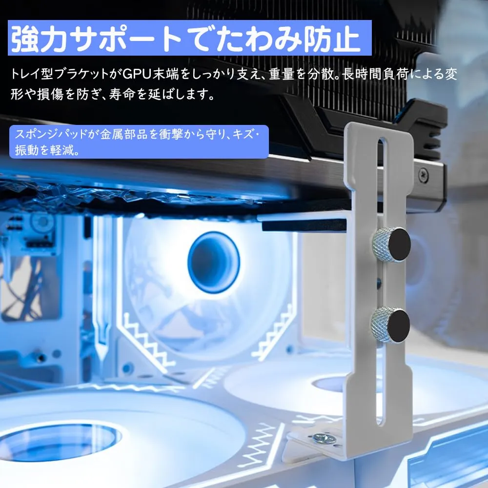 【強力サポートでたわみ防止】トレイ型ブラケットがGPU末端をしっかり支え、重量を分散。長時間負荷による変形や損傷を防ぎ、寿命を延ばします。
