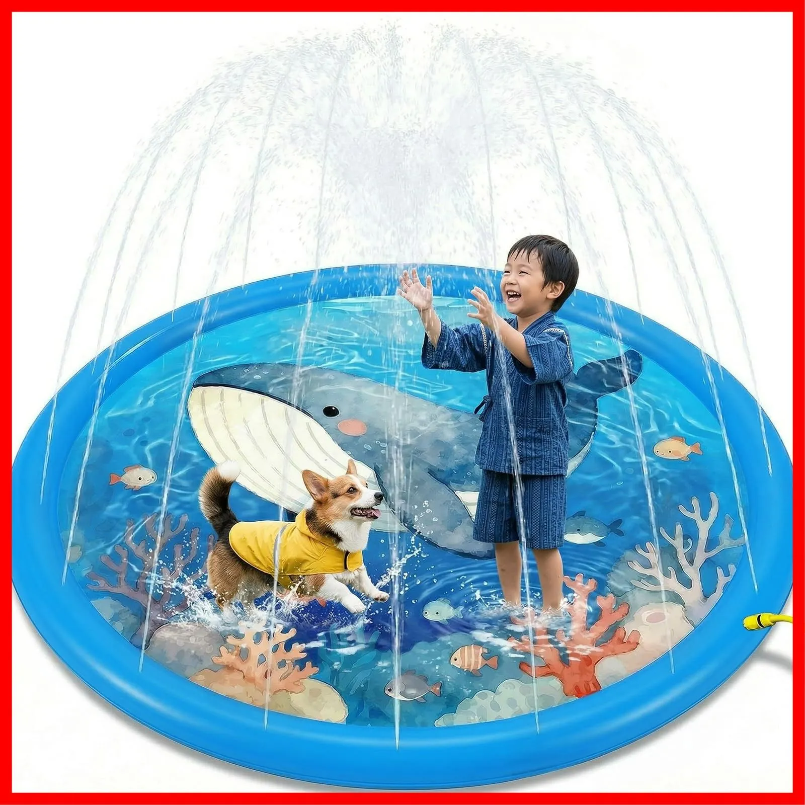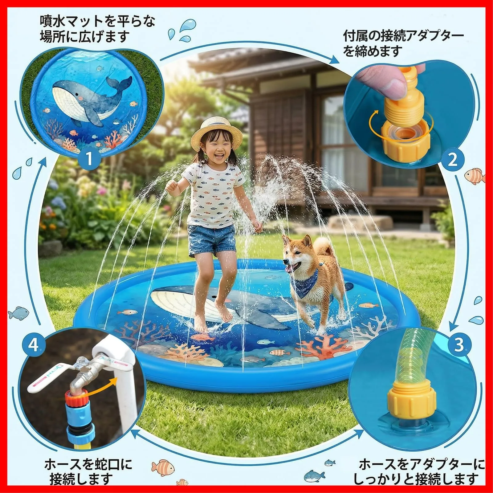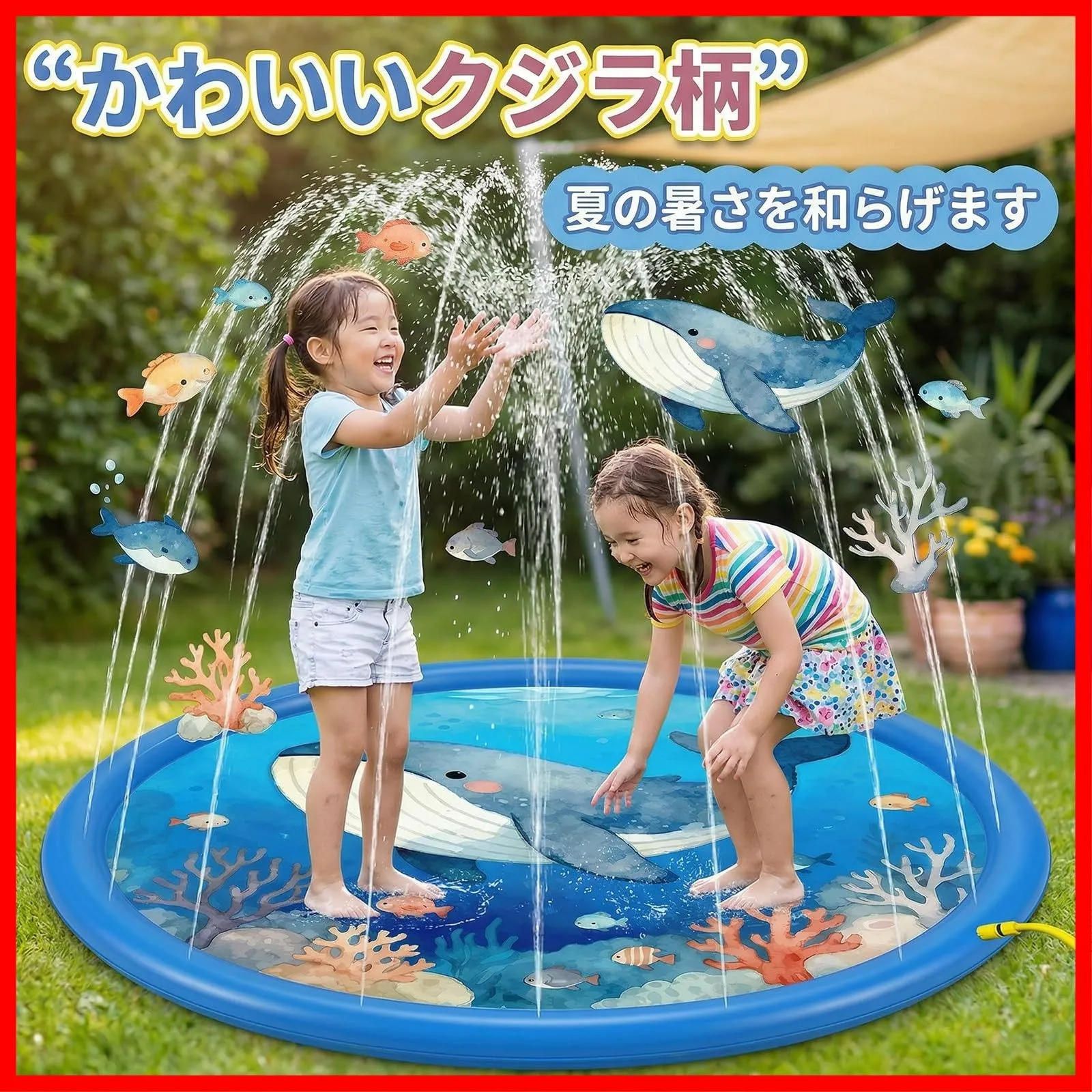 【夏にぴったりの噴水マット】お庭や芝生に広げて、ホースで蛇口につなぐだけで、簡単に涼しく楽しい水遊びマットが完成します。空気を入れる必要はなく、手軽に設置や片付けができ、すぐ子供たちの笑顔があふれる水遊びを始められます。そして、かわいいクジラや小さな魚が描かれた噴水プールは、見た目も楽しく、子どもの想像力を自然と引き出してくれます。夏の暑さを和らげながら、水遊びを存分に楽しみましょう