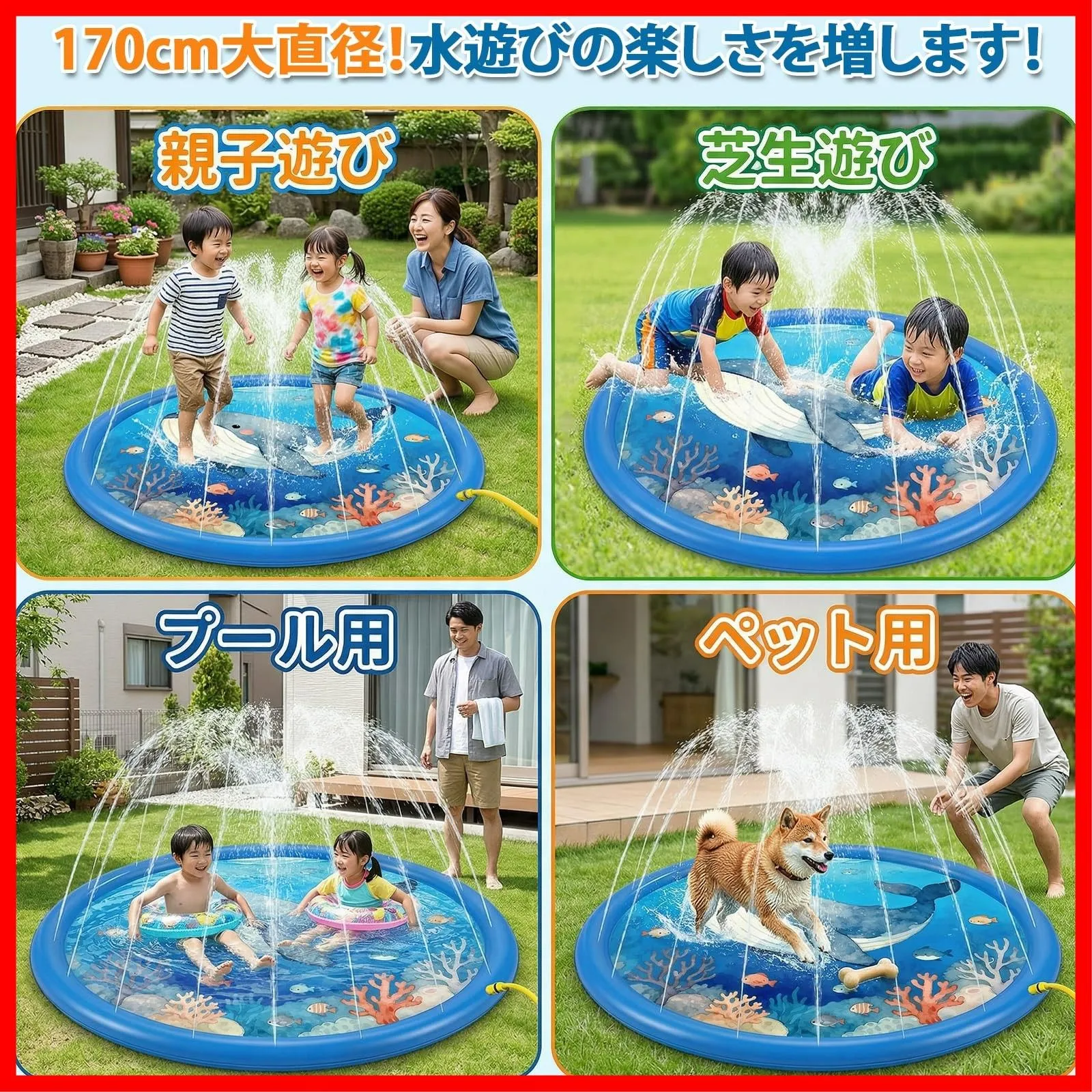 家庭 芝生遊び 親子遊び プールマット 水遊び プレイマット かわいい 空気入れ不要 夏対策(クジラ柄) 3段階の噴水高さ ペット用 子供用 直径170CM Ninonly 噴水プール 噴水マット