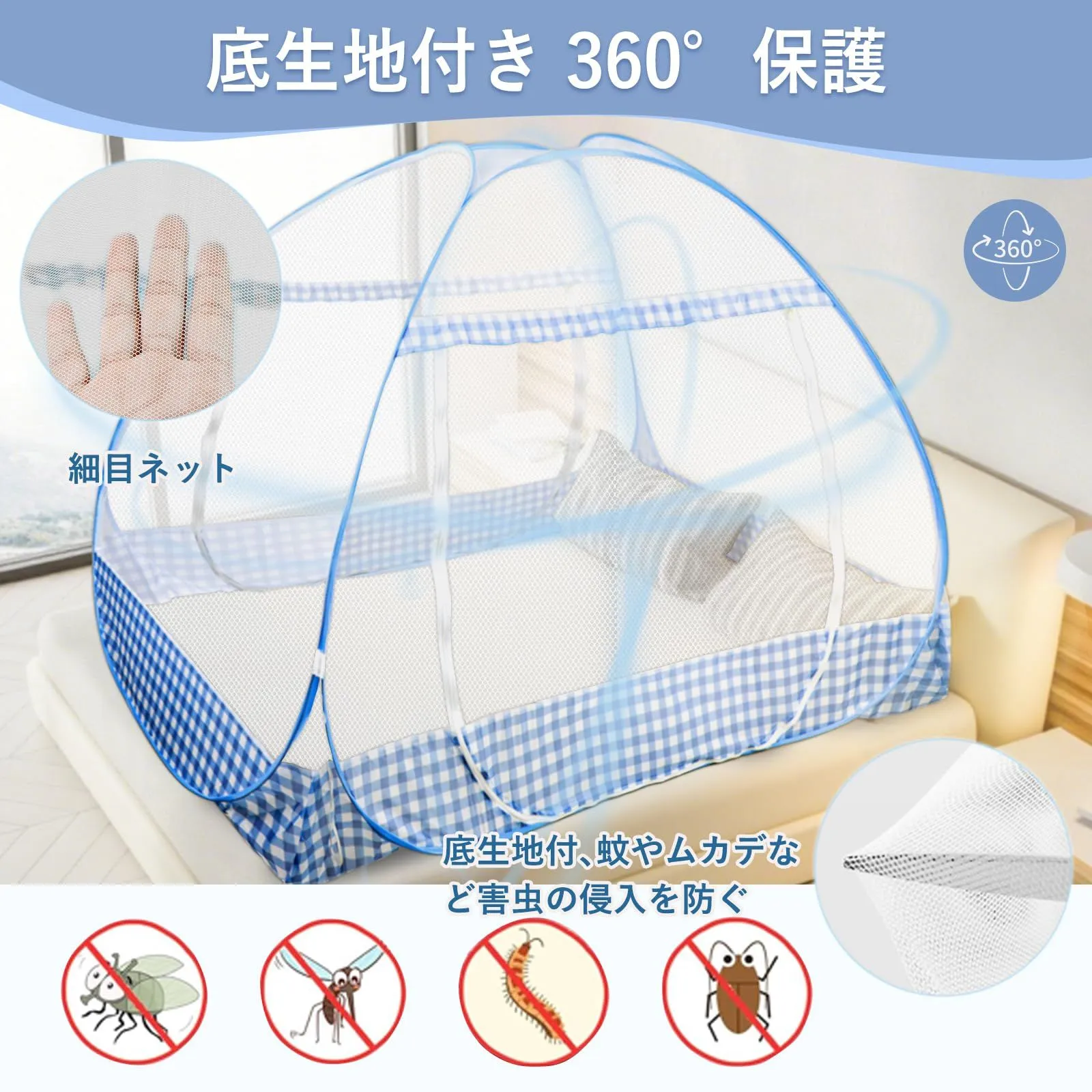 【底面付き】蚊帳の底面もメッシュ生地になっており、全方位から害虫の侵入をしっかり防ぎます。ムカデやゴキブリなど、床からの侵入もシャットアウトしますので、安心してお使いいただけます。さらに、底部には虫刺され防止の布が付いており、睡眠中に蚊帳の端に触れても肌をしっかり守ります。