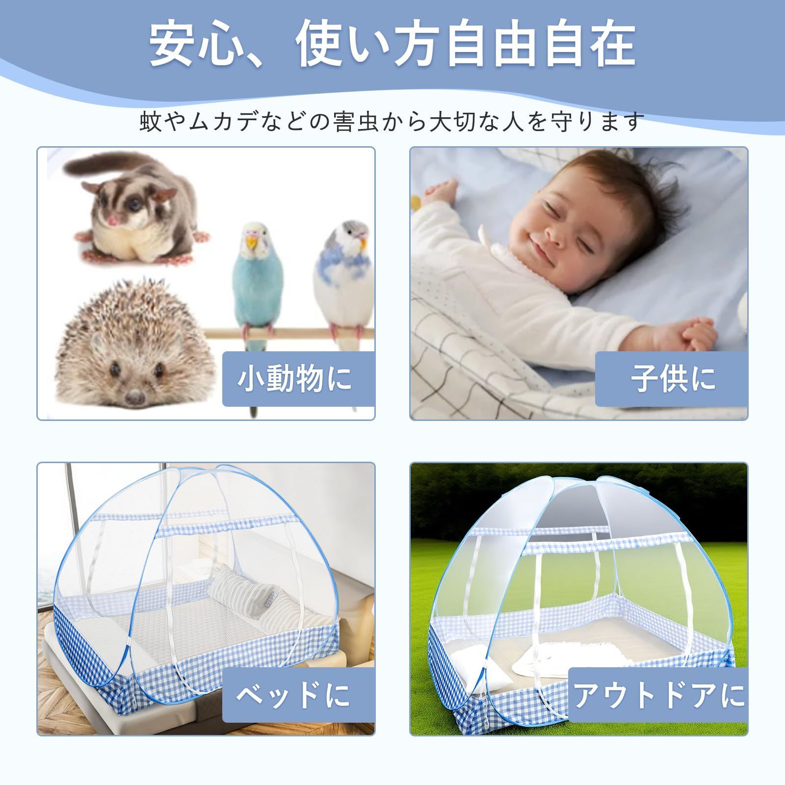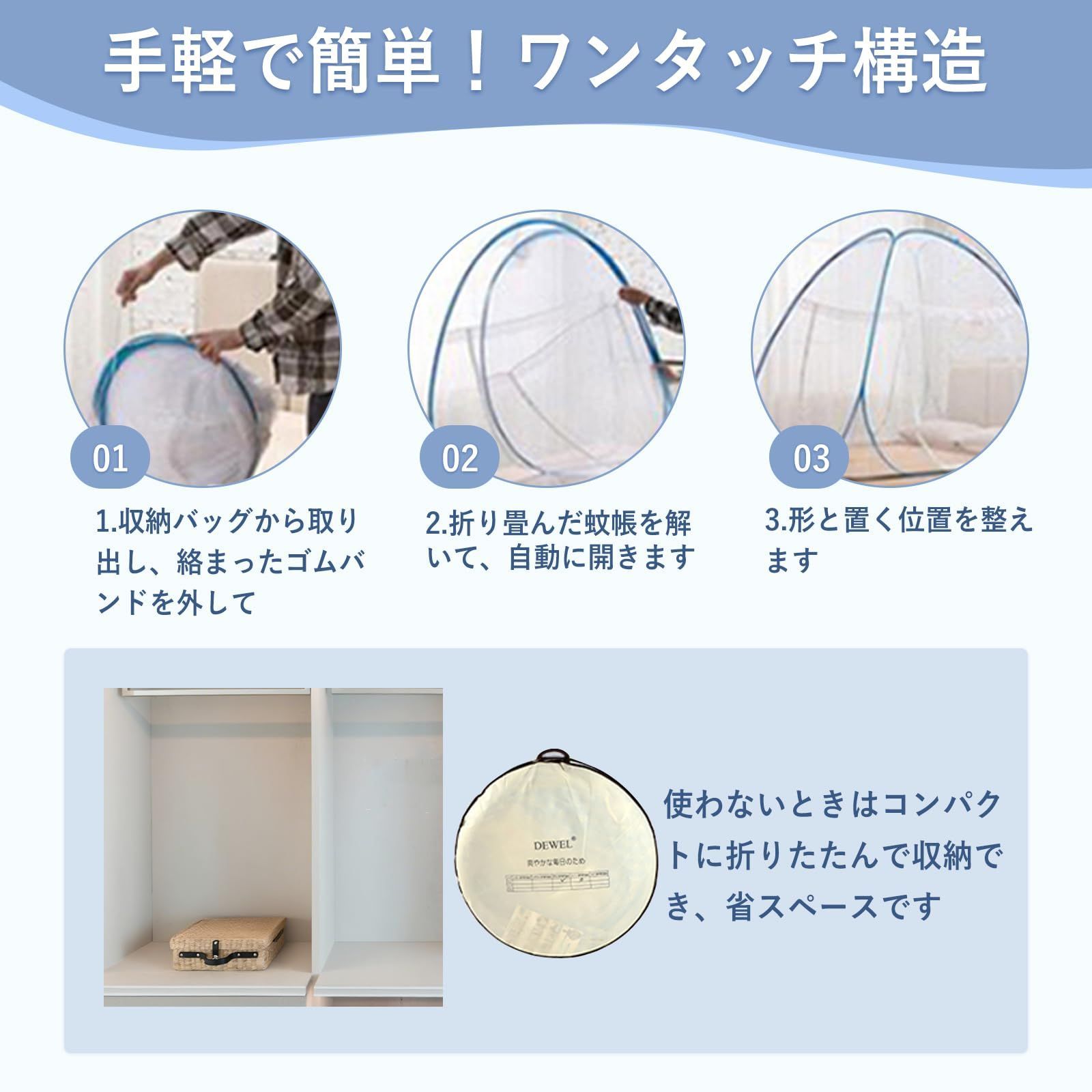 【ワンタッチ式&収納も簡単】テント型の蚊帳は収納袋から取り出すとワンタッチで自動的に展開されます。あとは上部の固定ワイヤーを取り付けるだけで設置が完了します。初めての方でも簡単に扱えます。使わないときはコンパクトに折りたたんで収納でき、省スペースです。専用の収納バッグが付属しており、キャンプやアウトドアでの持ち運びにも便利です。