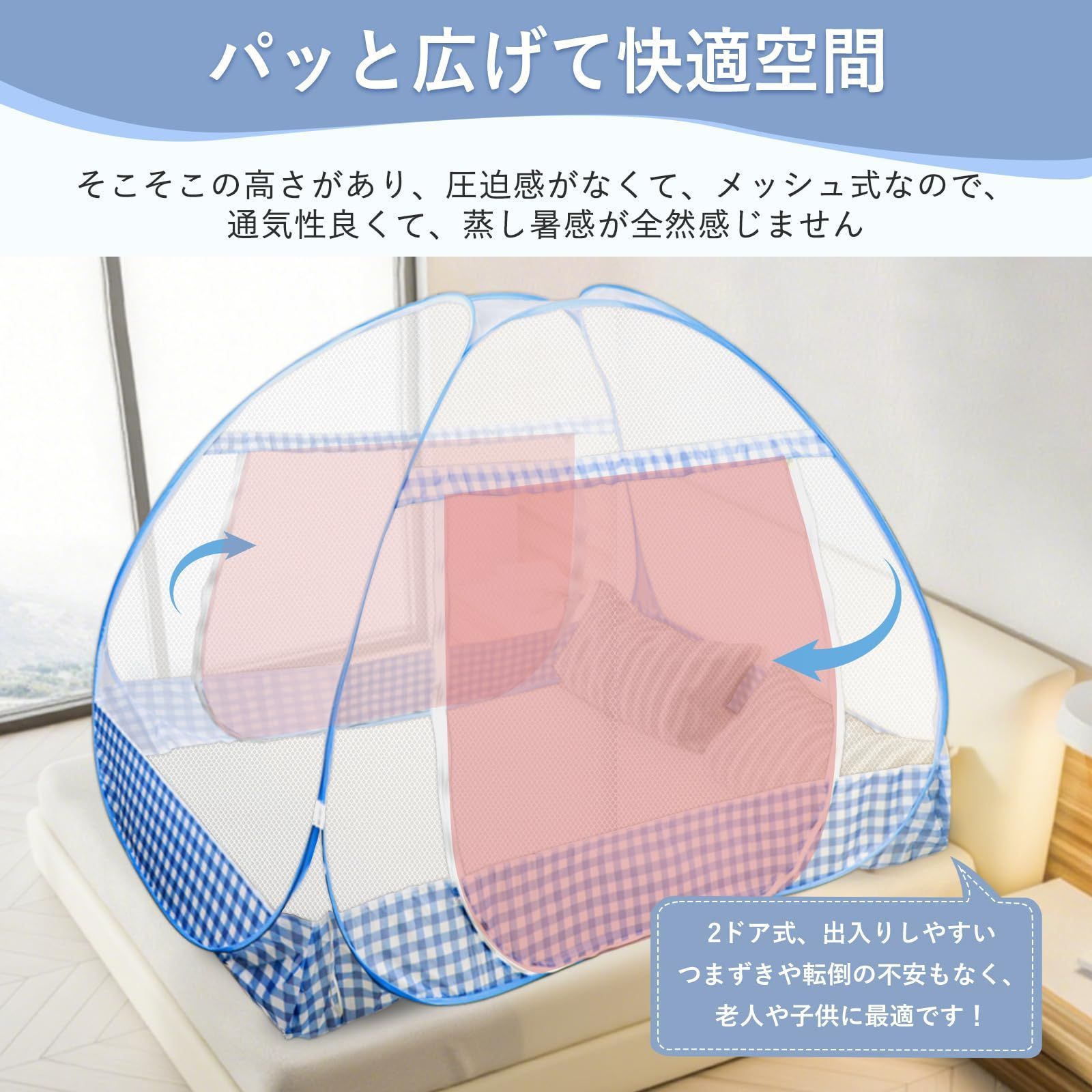 【安全設計&広々空間】蚊帳の底面と側面は安定した三角形の構造になっており、赤ちゃんをやさしく包み込むように保護します。寝返りによるベッドからの落下を防ぎ、転倒時の衝撃もやわらげて、夜間も安心です。高さは約130cmとゆとりがあり、大人でも圧迫感なく快適にお使いいただけます。 ブランド DEWEL 材質 ポリエステル 色 ブルー 商品の寸法 130長さ x 200幅 cm メーカー LW-WZ-SM-0366-200CM 最後までご確認頂き誠にありがとうございました。 上記をご確認頂き、ご購入いただけましたら幸いです。 何かご不明な点がございましたらお気軽にメッセージからお問い合わせ下さい。