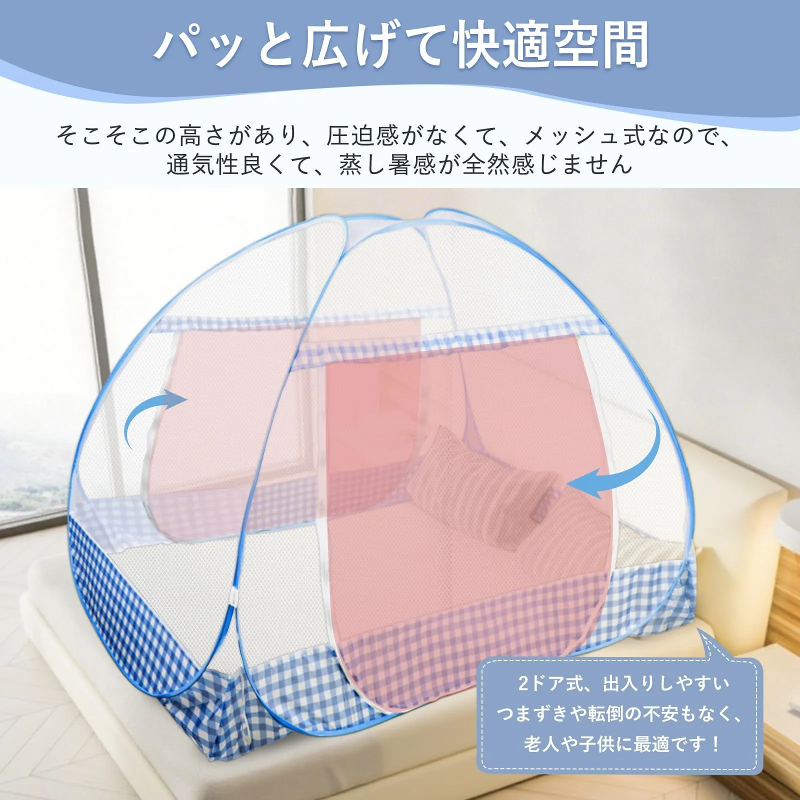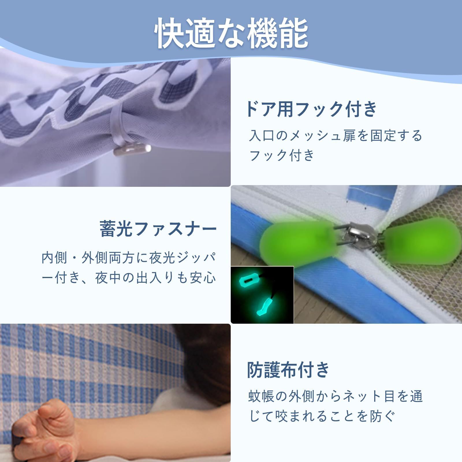 【2ドアタイプ&蓄光付き両面ファスナー】2箇所の出入り口があり、就寝時の出入りや布団の出し入れもスムーズにできます。ファスナーは内側・外側どちらからでも開閉できる両面仕様です。さらに、蓄光タイプの引き手を採用しているため、暗闇でもファスナーの位置がひと目でわかり、夜中の出入りも安心です。