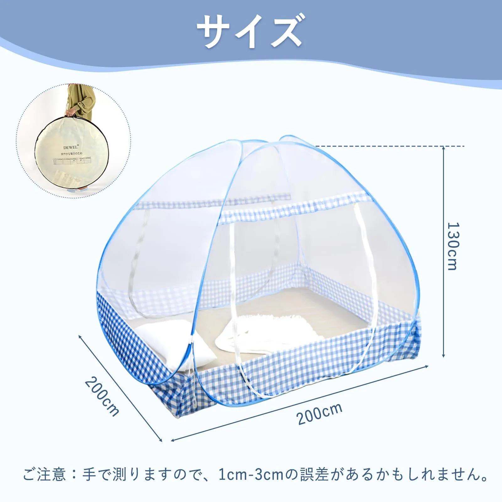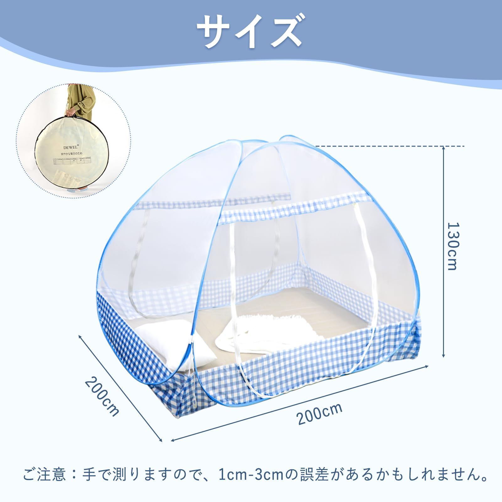 200*200*130cm 持ち運び便利 収納袋付 収納便利 蓄光ファスナー付き ムカデ対策 虫/蚊よけ 夏対策 高密度 蚊帳んぽ ベッド モスキートネット 折り畳み可能 ワンタッチ 2ドアタイプ かや 底付き テント式 蚊帳 DEWEL