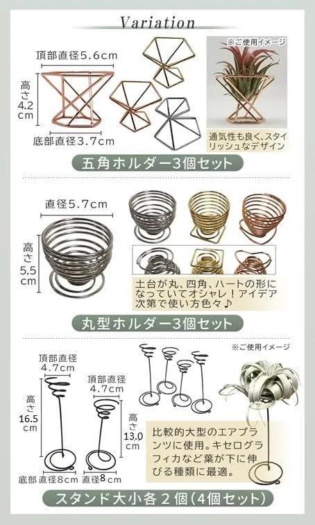 【お好みで選べる、おしゃれなデザイン】五角形、丸型ホルダーはさかさまにしても小さなエアプランツを飾れます。工夫次第で飾り方は無限大!丸型ホルダーは土台が丸、四角、ハートになっており、アイデア次第で色々な使い方ができます。