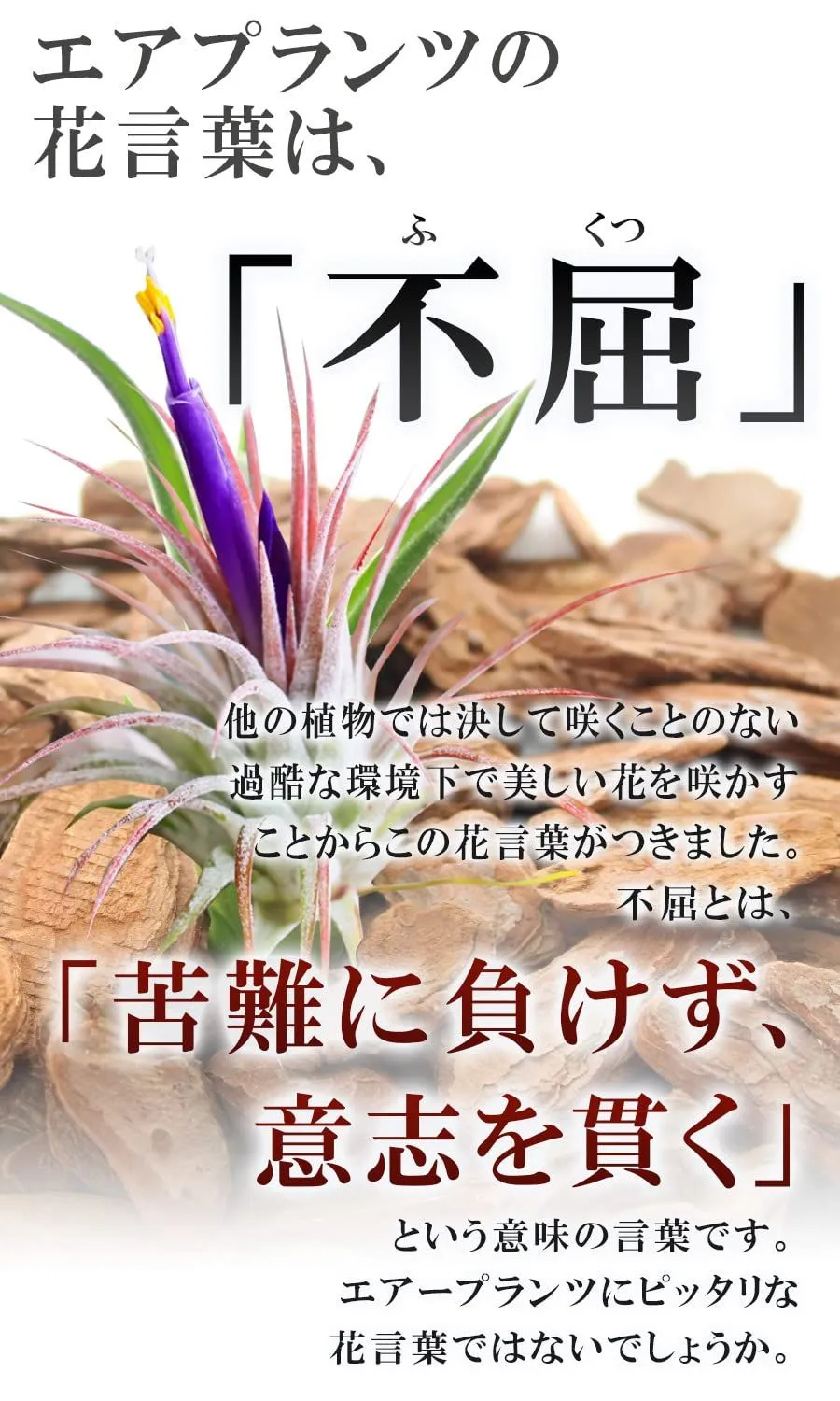 【エアプランツの花言葉「不屈」】他の植物では決して咲くことのない過酷な環境下で美しい花を咲かすことからきています。不屈とは、「苦難に負けず、意志を貫く」という意味の言葉です。エアープランツにピッタリな花言葉ではないでしょうか。
