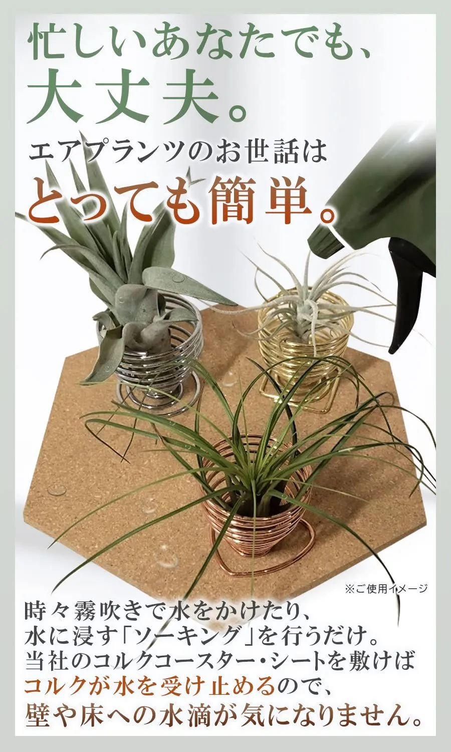 【忙しいあなたでも、大丈夫。】エアプランツのお世話はとっても簡単。時々霧吹きで水をかけたり、水に浸す「ソーキング」を行うだけ。当社のコルクシートやコースターを敷けばコルクが水を受け止めるので、壁や床への水滴が気になりません。