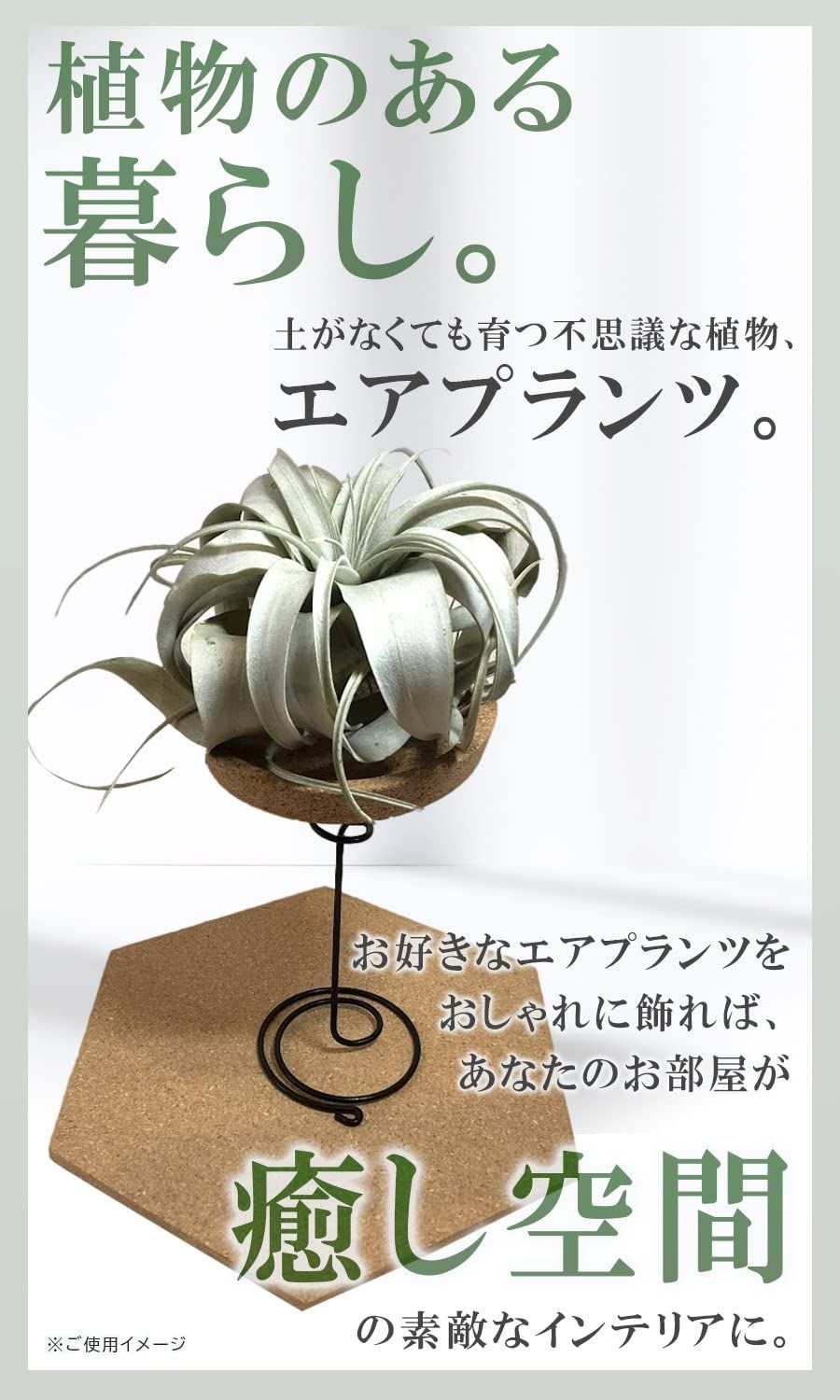【見せ方の幅が広がるコルクシート】六角コルクシートは、裏がシールになっているため壁にかけてコルクボードとしてもお使いいただけます。壁にエアプランツを飾っても素敵なインテリアに。丸型のコルクコースターは裏表どちらも使えます。イオナンタなどは直接置いてもオシャレ!