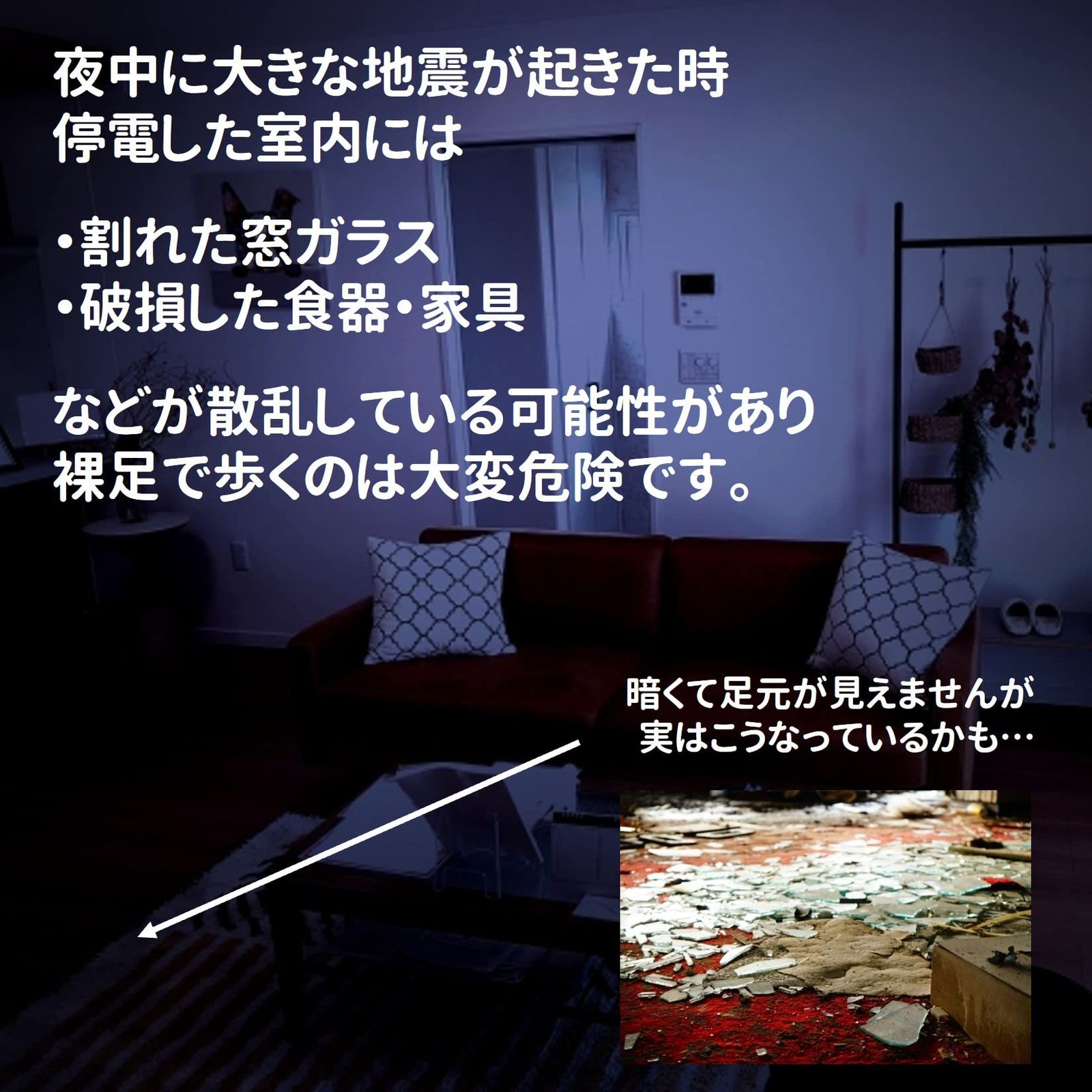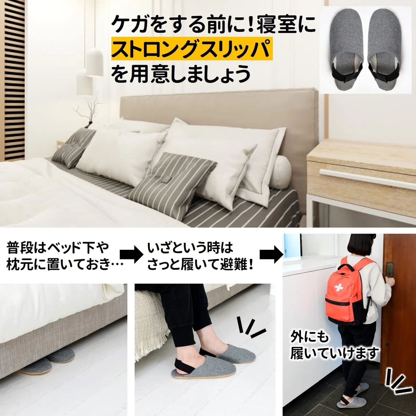 【防災スリッパ備えてますか?】地震の後など室内に散らばる割れたガラスや屋外の瓦礫などから足を守る防災スリッパ。脚裏は釘なども貫通しない素材でできているので、枕元に備えておけば、暗くて足元が見えない夜間でも安心です。