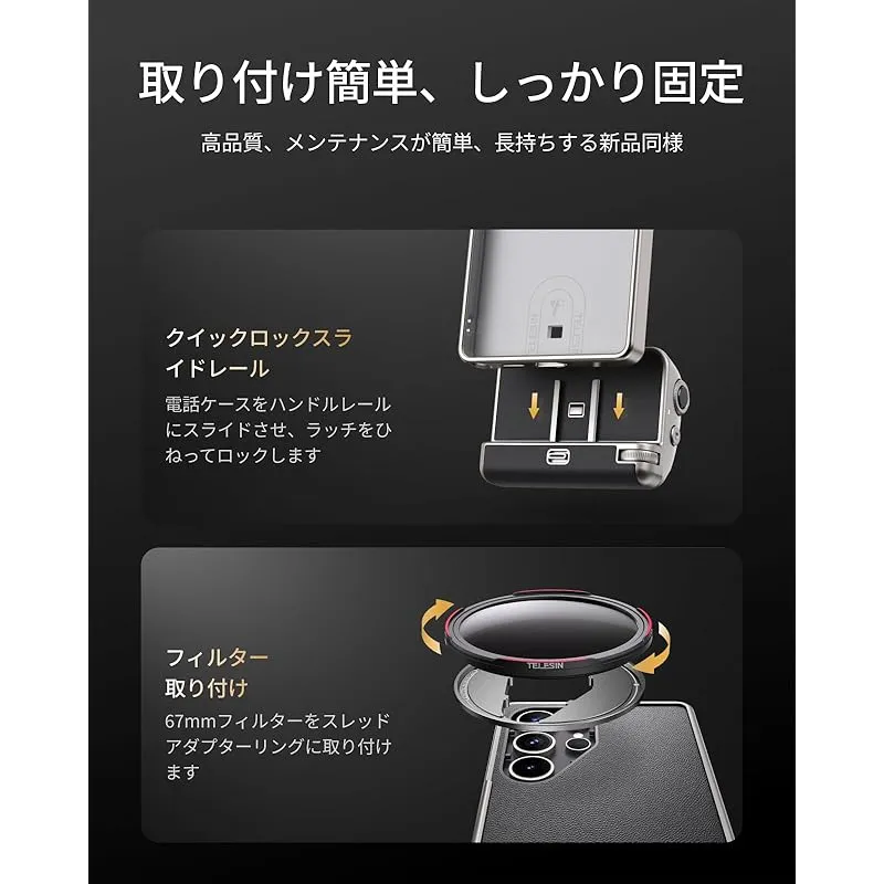 【プロ級の撮影を実現】TELESIN スマホグリップはGalaxy S25 Ultra 専用スマホケース付きで、スマートフォンを本格カメラに変身。コンパクトな人間工学フィンガーフックデザインがグリップ感を高め、安定性とバランスを提供。ポケットやバッグにも簡単に収納できます。
