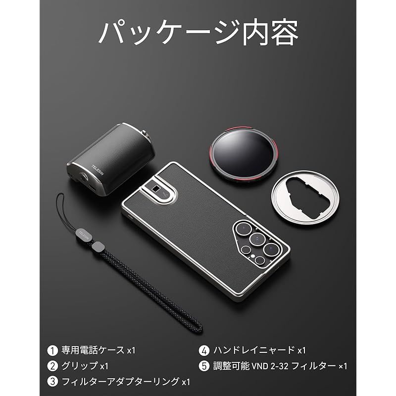 【対応機種:Galaxy S25 Ultra専用設計】本マスターグリップはGalaxy S25 Ultra専用写真撮影キットです。同梱内容:マスターグリップ撮影グリップ×1、専用スマホケース×1、67mm ND2-ND32 VND減光フィルター×1、ハンドルストラップ×1、フィルターアダプターリング×1。