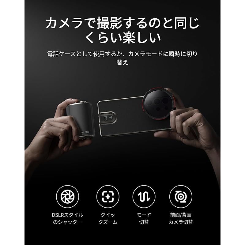 【精密コントロールシステムでスムーズな撮影】?? スマホ撮影グリップは二段階シャッターボタンと専用クイックズームスライダーで、撮影操作と滑らかなフォーカス調整を簡単にコントロール。モード切替ボタンで写真/動画/連写モードを瞬時に切り替え可能。TELESIN プロキットなら、スマホを外さずに縦位置から横位置へのシームレスな移行が実現します。