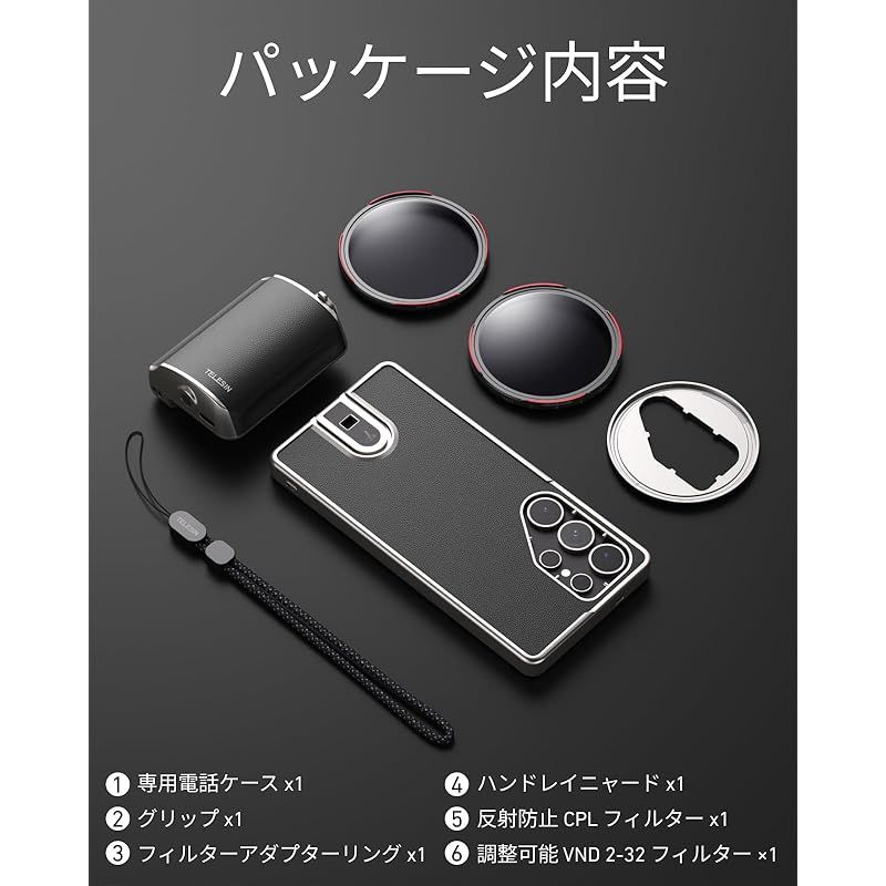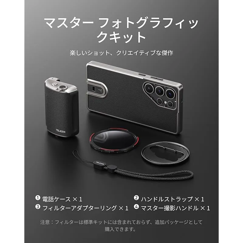 【対応機種:Galaxy S25 Ultra専用設計】本マスターグリップはGalaxy S25 Ultra専用写真撮影キットです。同梱内容:マスターグリップ撮影グリップ×1、専用スマホケース×1、67mm CPL偏光レンズ×1、67mm ND2-32 VND減光ミラー×1、ハンドルストラップ×1、フィルターアダプターリング×1。