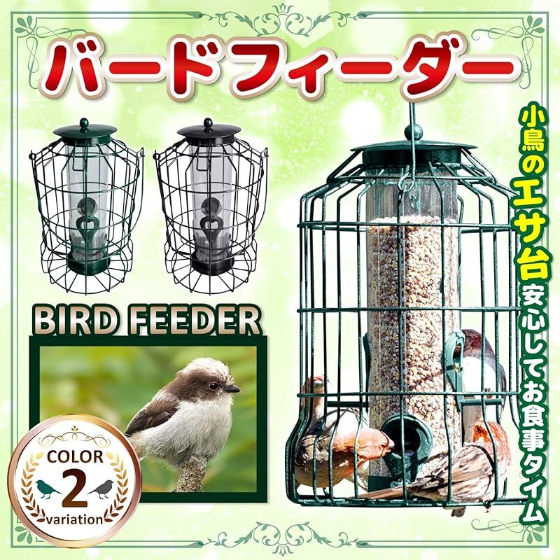 【商品概要】 バードフィーダー ヒヨドリよけ えさ台:庭でゆっくりと野鳥観察は楽しいですが、ヒヨドリに邪魔されるのは困りますよね。そんなお悩みに、ヒヨドリ対策をした、小鳥だけにエサを提供する野鳥の餌台が登場です。緑のエサ台です。 一般的な鳥の餌台を設置しても、ヒヨドリが大きな声でやってきては騒ぎ立て、他の小鳥たちが近寄れない、という経験はありませんか?鳥餌台に来るヒヨドリをどうにかしたい。鳥のエサがみんな食べられてします。そんな悩みを解決するのがこのバードフィーダーです。こちらは 野鳥 餌入れ 屋外用です。 鳥のえさ台は、防護柵付きでヒヨドリ侵入を防ぎ、小鳥たちの安心空間を実現。約3cmの格子で、小鳥が快適に食事を楽しめる設計。エサ補充も簡単。メジロ、シジュウカラ、ヤマガラなど、小鳥たちが安全に食事を楽しめるバードフィーダー 屋外です。 バードフィーダー オクガイのサイズとカラー:25cm(底から取手まで)、取手14.5cm、幅17cm ブラックとグリーンの2色 ※モニターの環境によっては、実際の色と若干異なる場合があります。※鳥のえさだいは、ヒヨドリの大きさによっては、鳥のえさだいの中に入れる場合もございます。また、ヒヨドリより小さいムクドリの場合も同様となります。 推奨事項:バードフィーダー 吊り下げは、容器を清潔に保つため定期的な掃除。穀物をたくさん入れすぎると詰まる原因になります。エサの上は屋根付きですが、大雨等の場合水の侵入で餌が腐る場合もございます。設置は雨で濡れない所がおすすめです