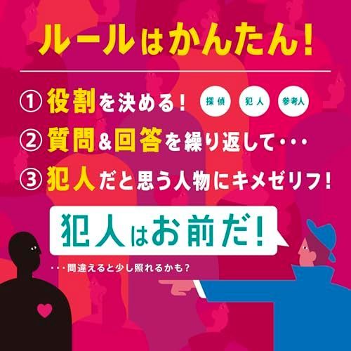このゲームは、質問に対して犯人役だけがウソをつき、ほかの人は本当のことを答えるルール。相手の表情や答え方を見ながら推理するので、自然に会話が広がり、初対面同士でも打ち解けやすいのが特長です。